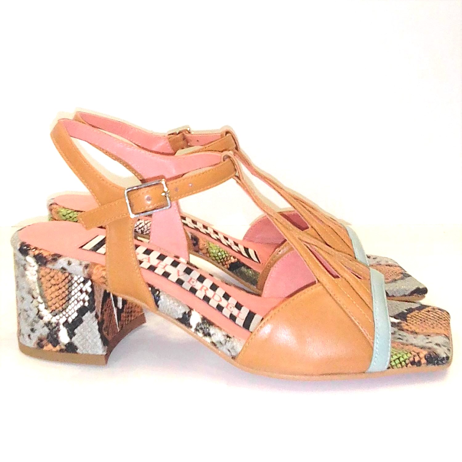 Sandalia de tacon en piel napa camel y detalles en piel estampada piton o reptil multicolor (verde, cuero, tostado y gris) y piel napa azul turquesa