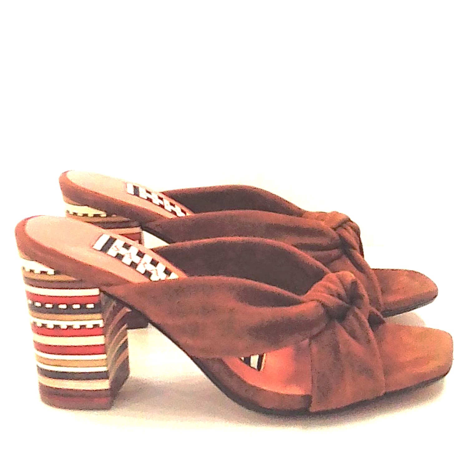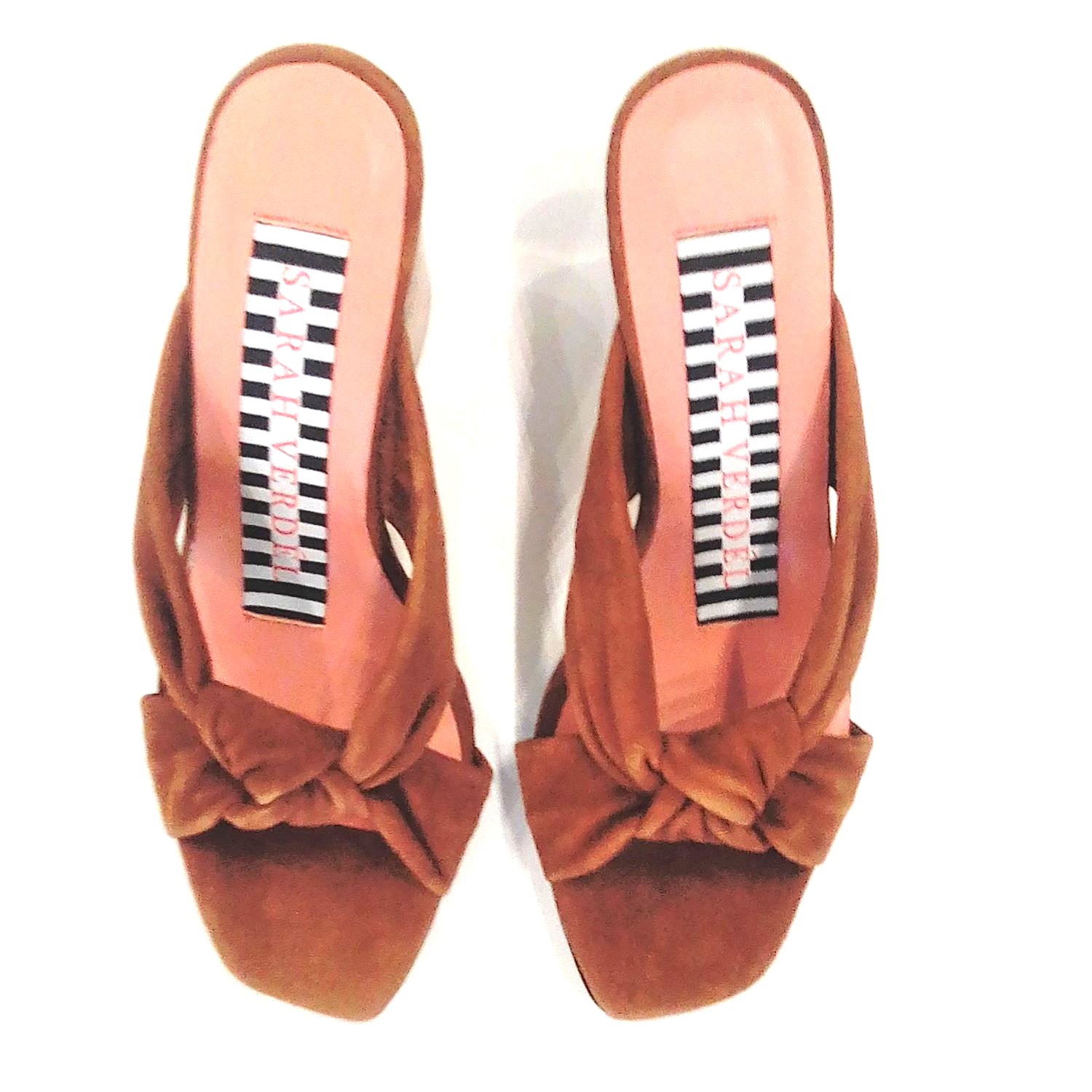 Sandalia de tacon en piel ante camel. Detalle tacon pintaro.