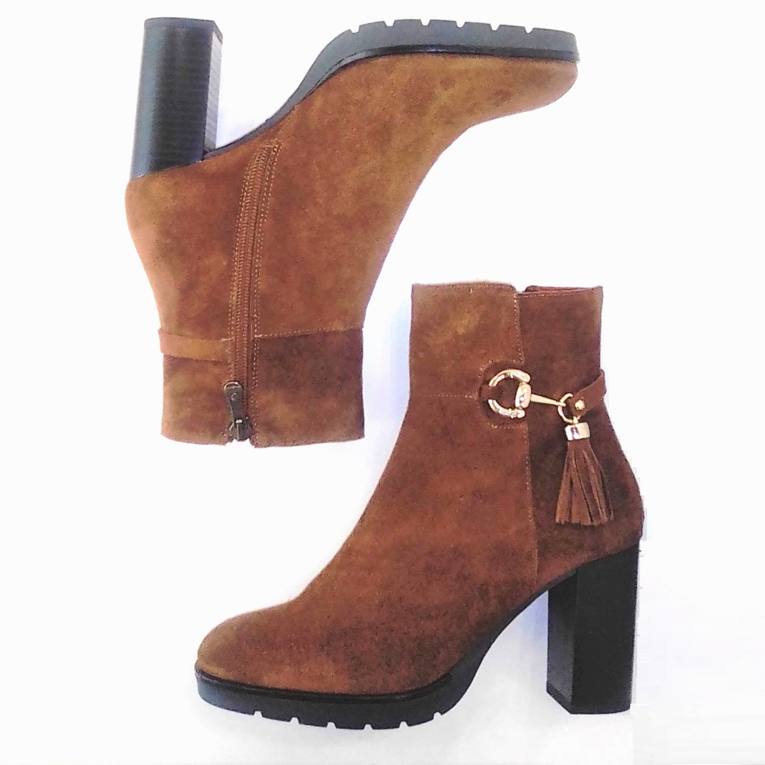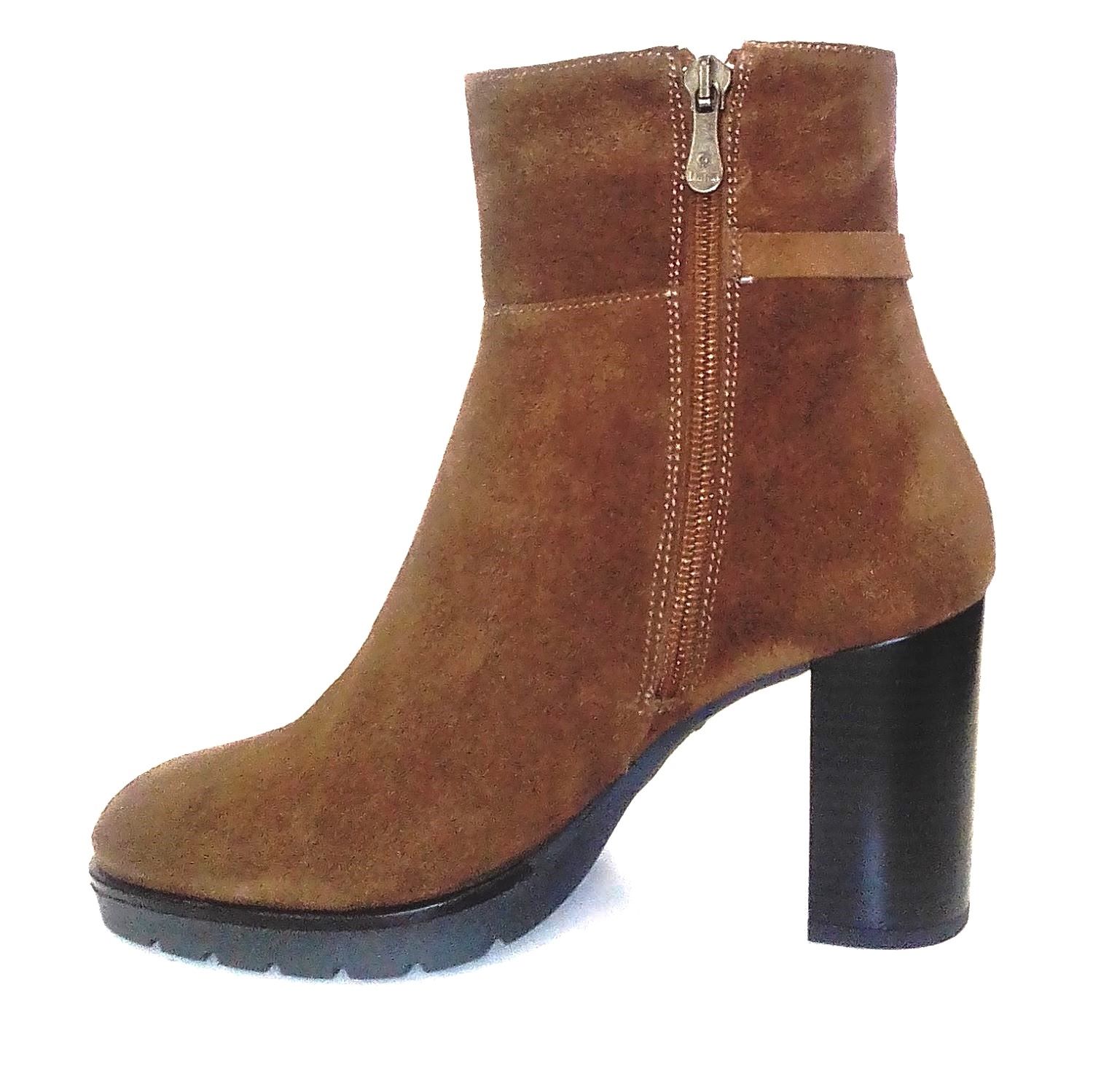 Botin en piel serraje camel. Suela track y plataforma. Se abrocha con la cremallera interior. Detalle de estribo y borla lateral.