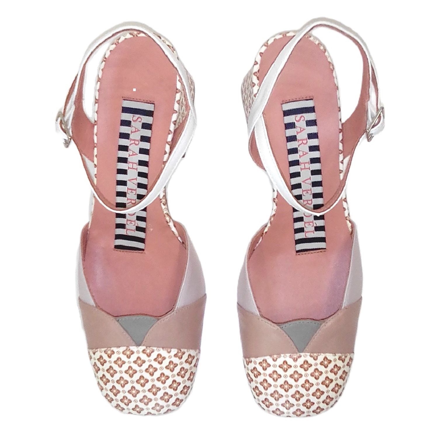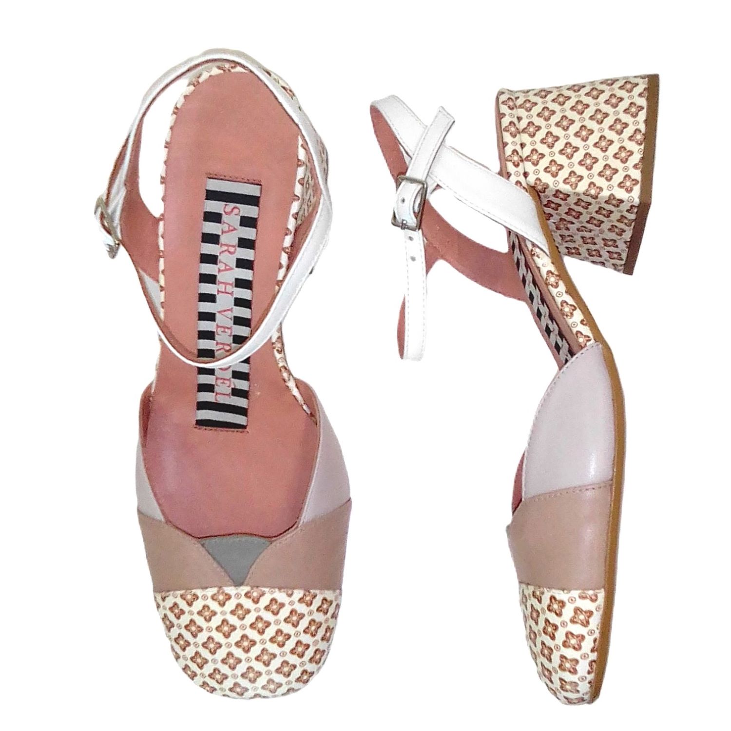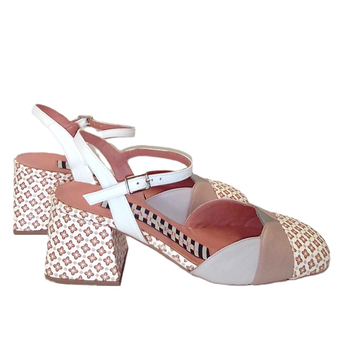 Zapato de tacon en piel napa estampada dibujo y piel napa multicolor (nude, blanco y gris). Zapato destalonado de aire retro
