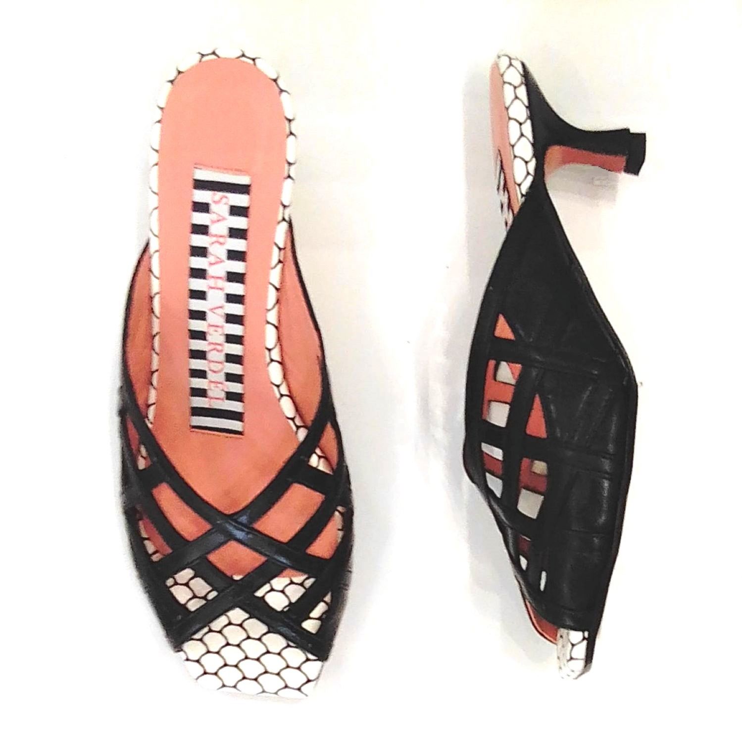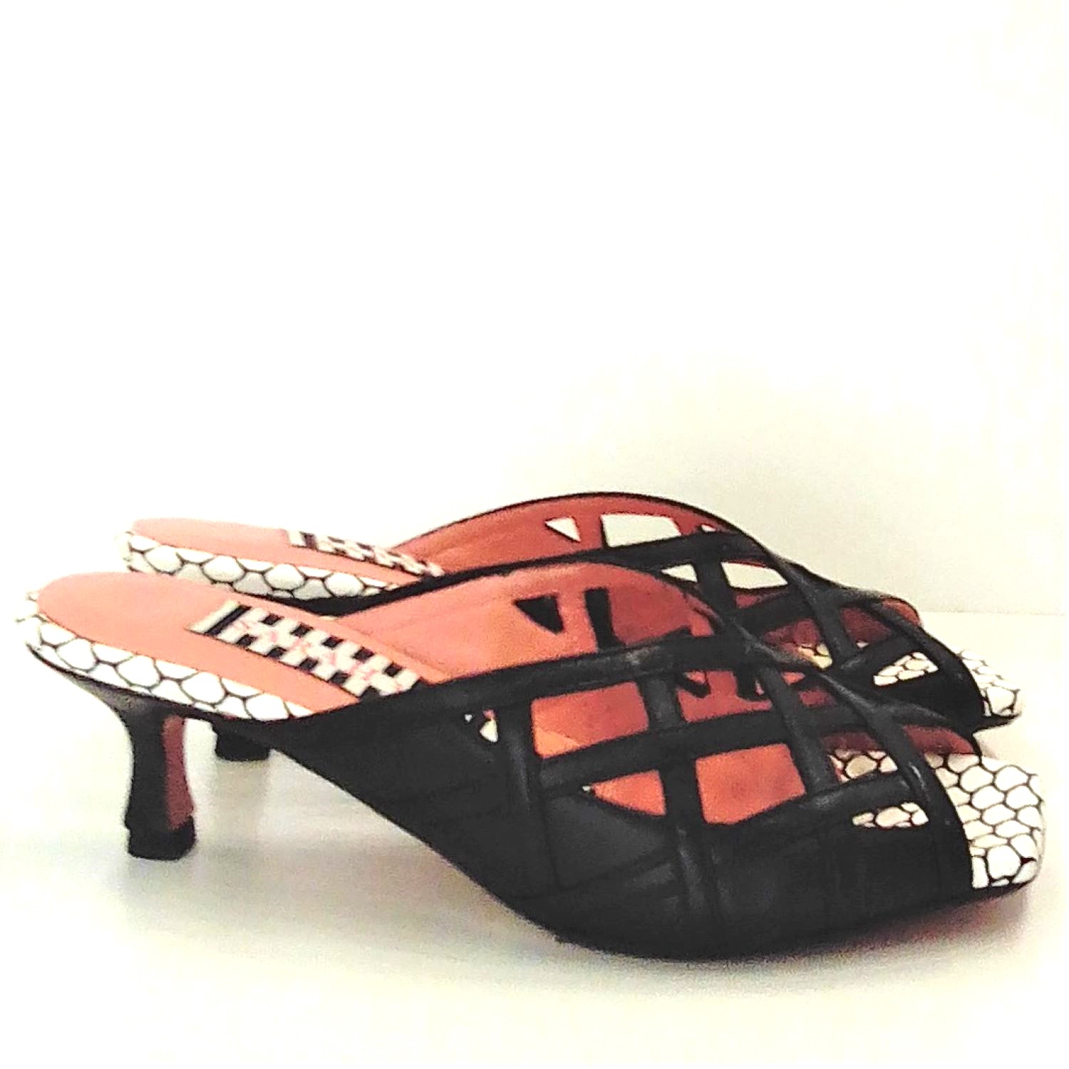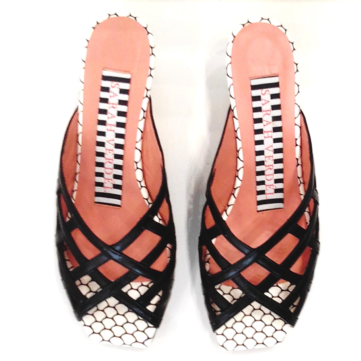Sandalia de tacon chupete en piel napa negra y detalles en piel estampada blanca y negra (estampado pez)