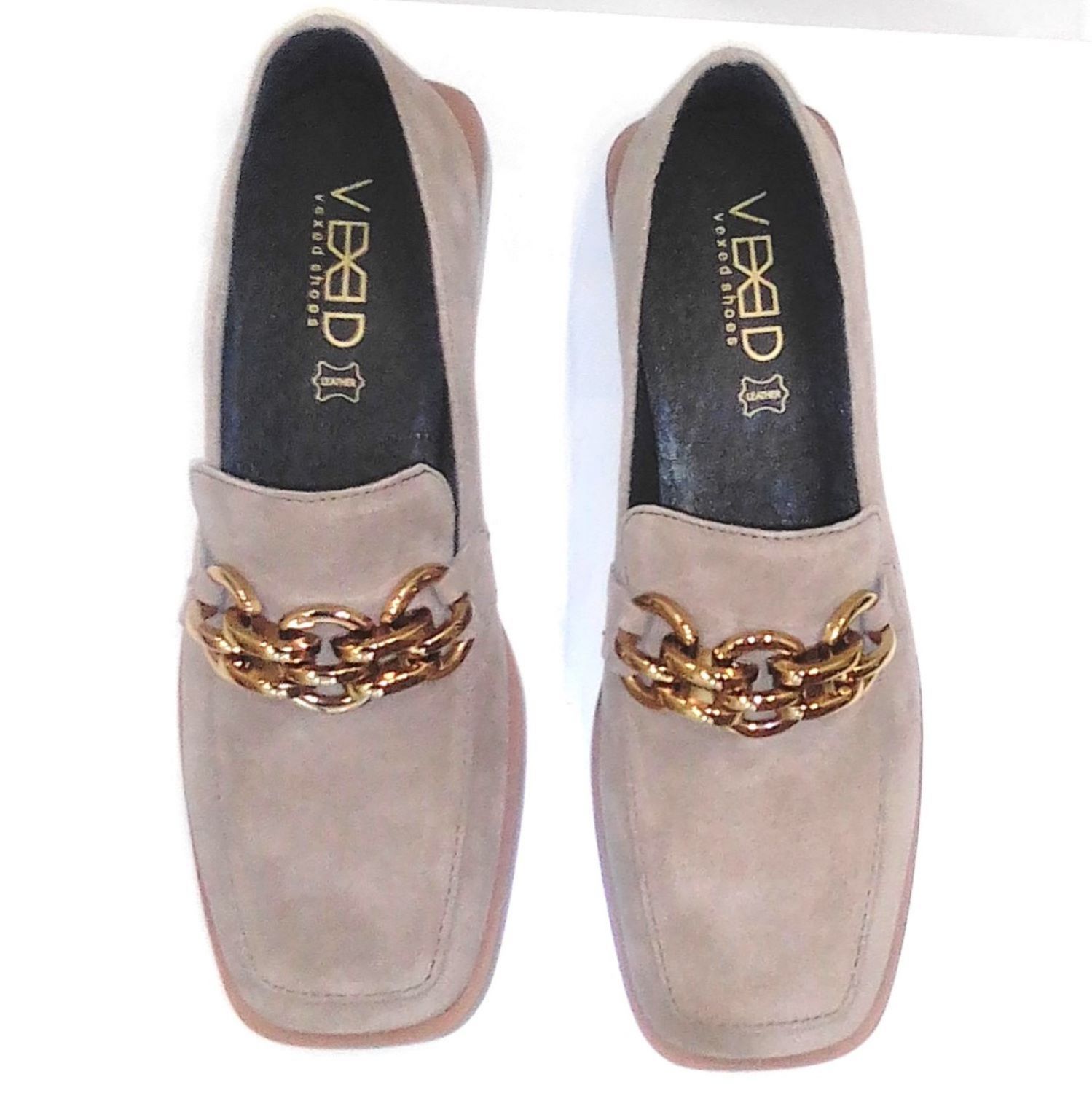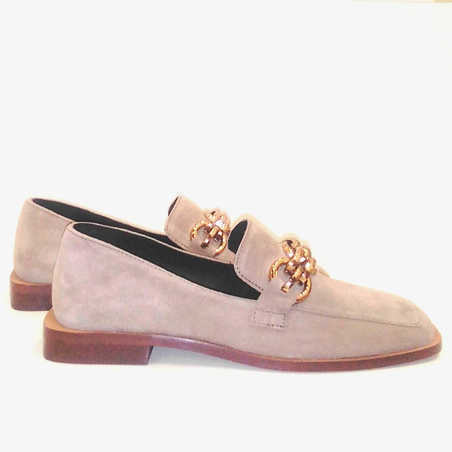 Mocasin plano en serraje taupe o beig. Detalle cadena. Tacon cuadraro