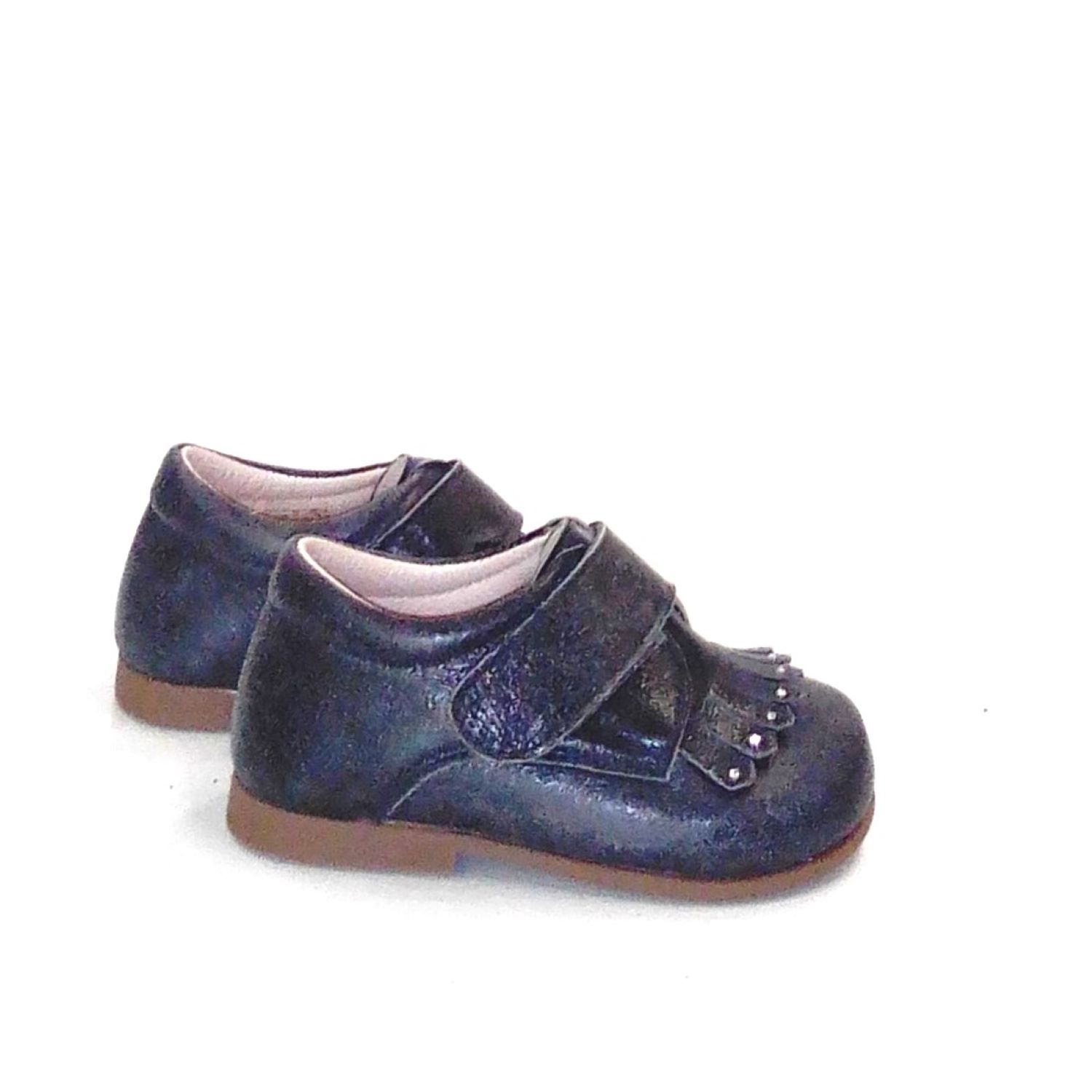 Blucher de estlo ingles, en piel napa metalizada gris plomo, con flecos. Detalle de strass. Coleccion Primeros Pasos. Con velcro