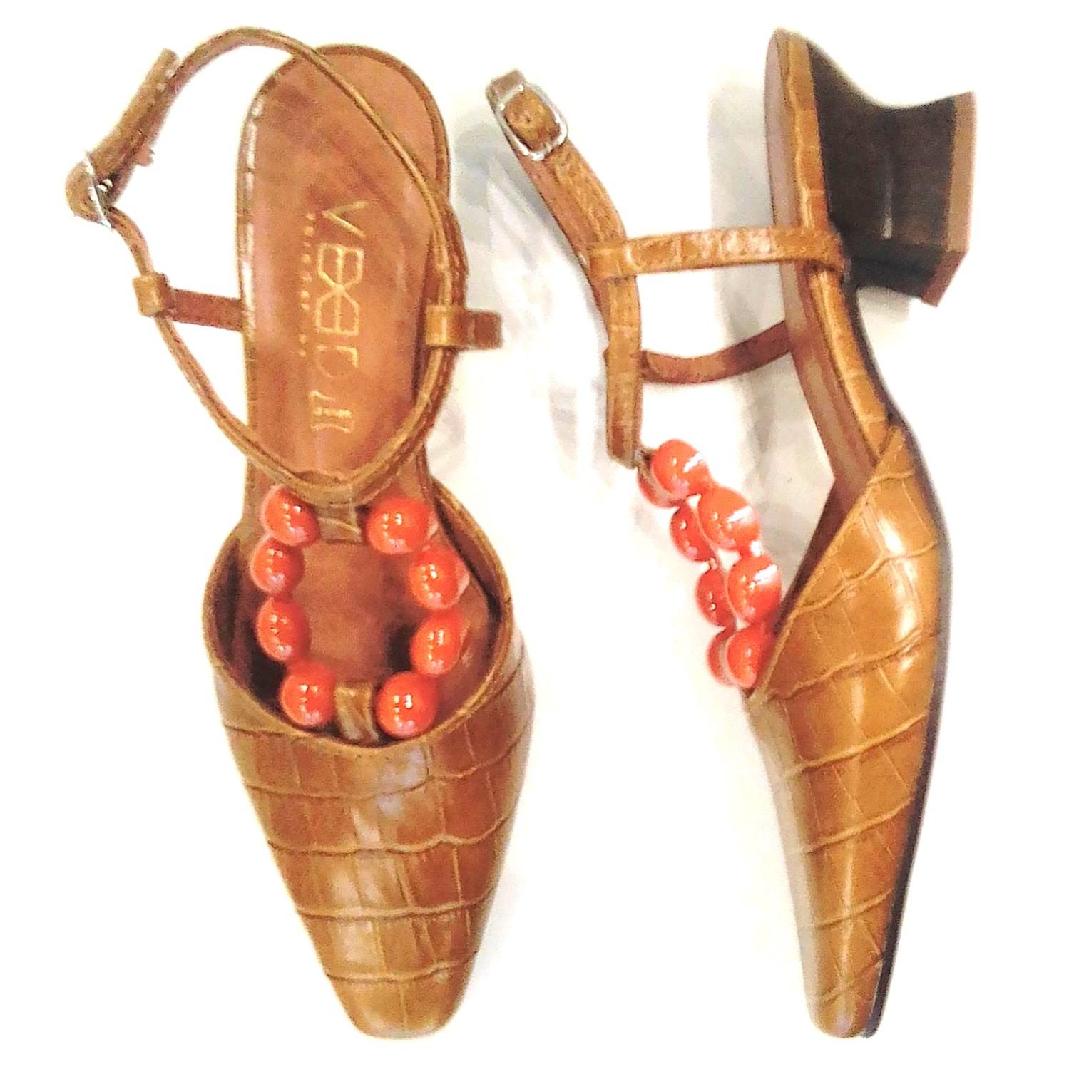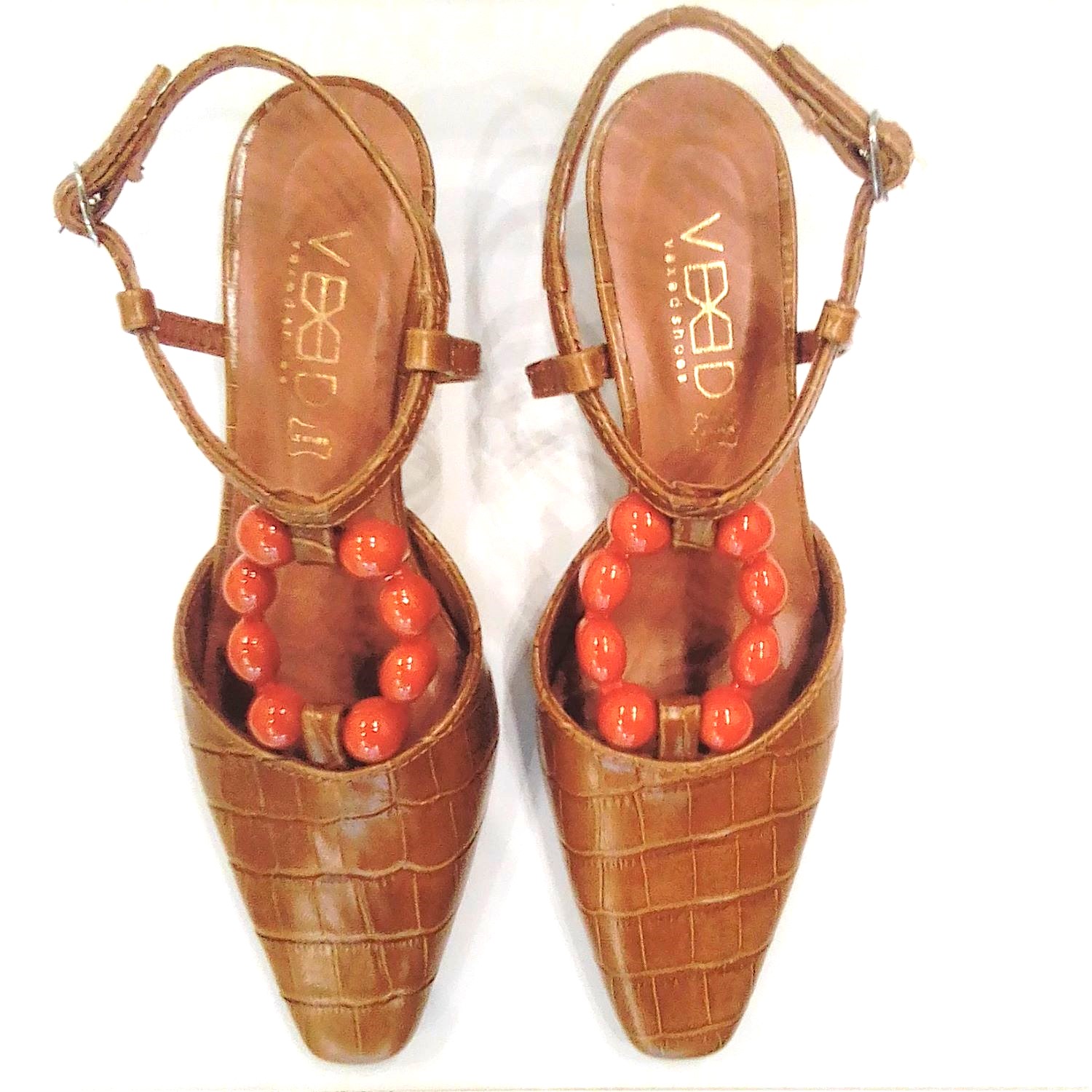 Zapato de tacon destalonado en piel grabada coco. Detalle de adorno en naranja en el empeina y tacon con forma de cola de pez.