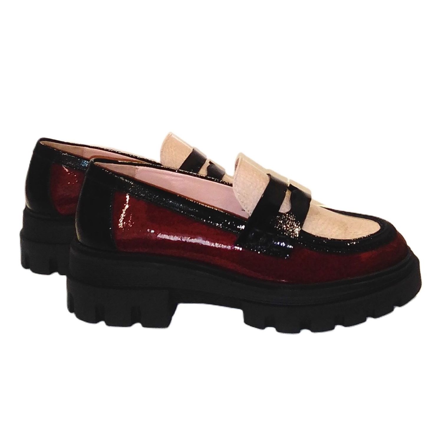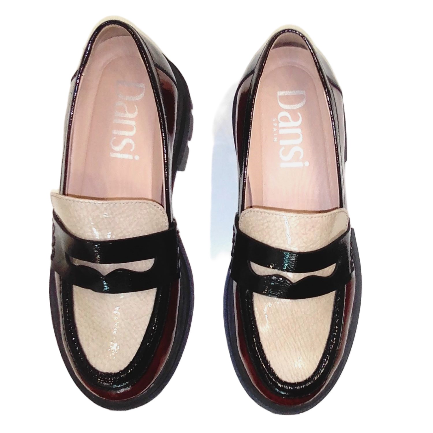 Mocasin en piel charol multicolor: burdeos, crema y negro. Con plataforma y suela track, Plantilla extraible.