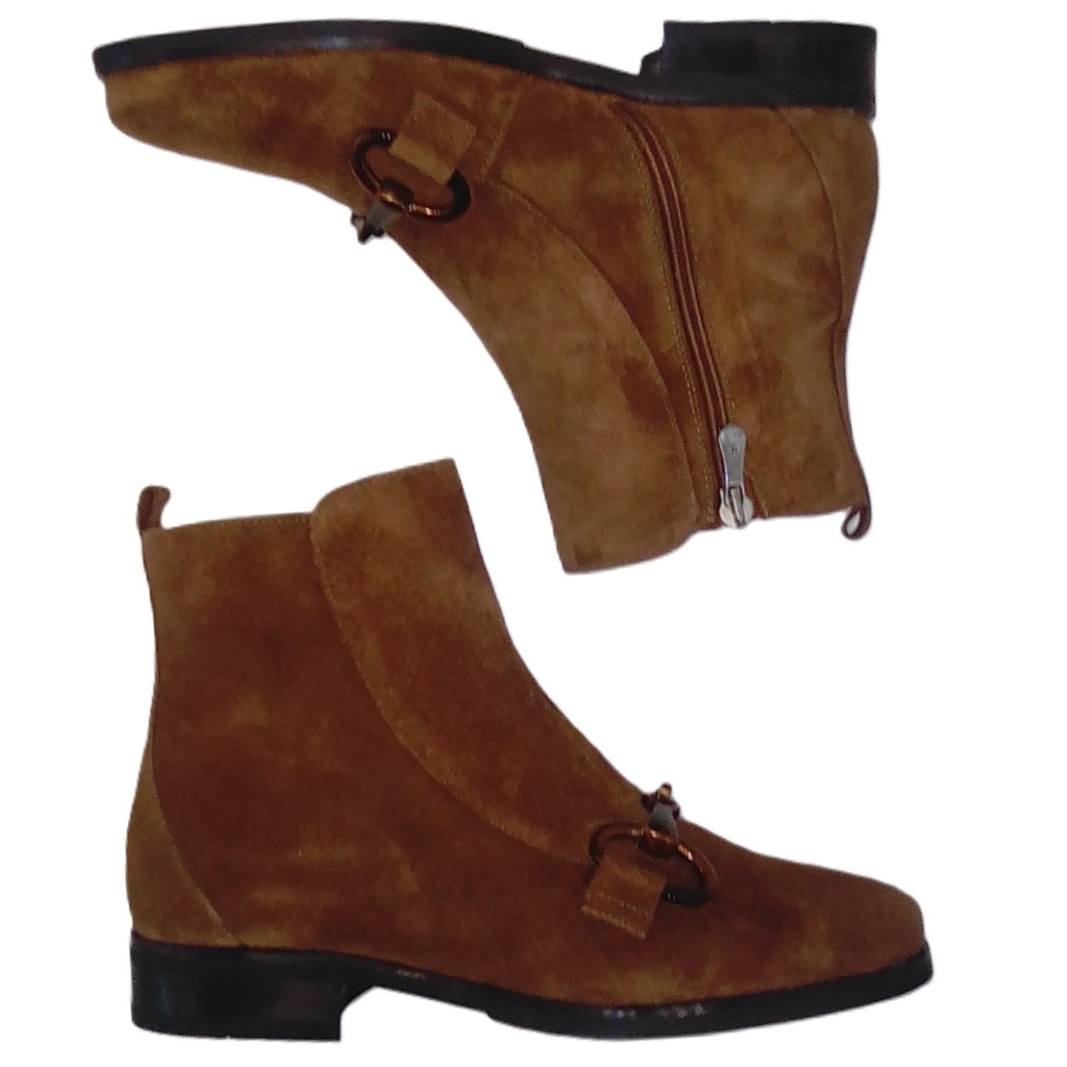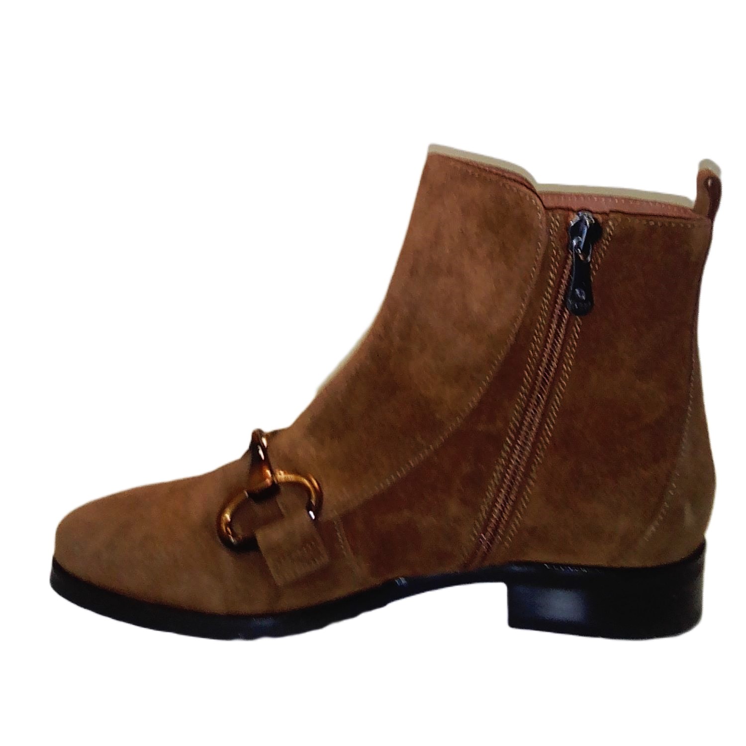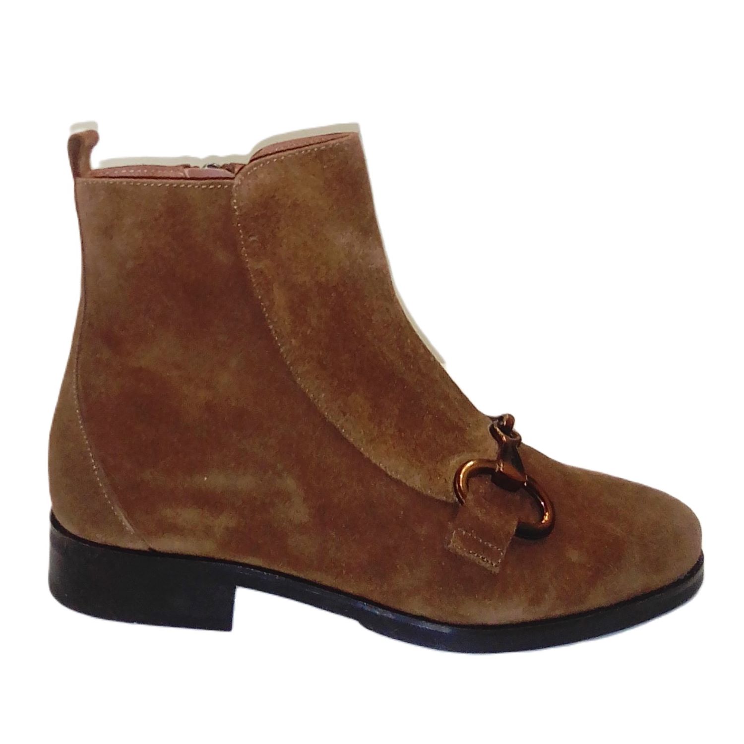Botin de estilo ingles en piel serraje camel. Se abrocha con la cremallera interior. Estribo en la pala.