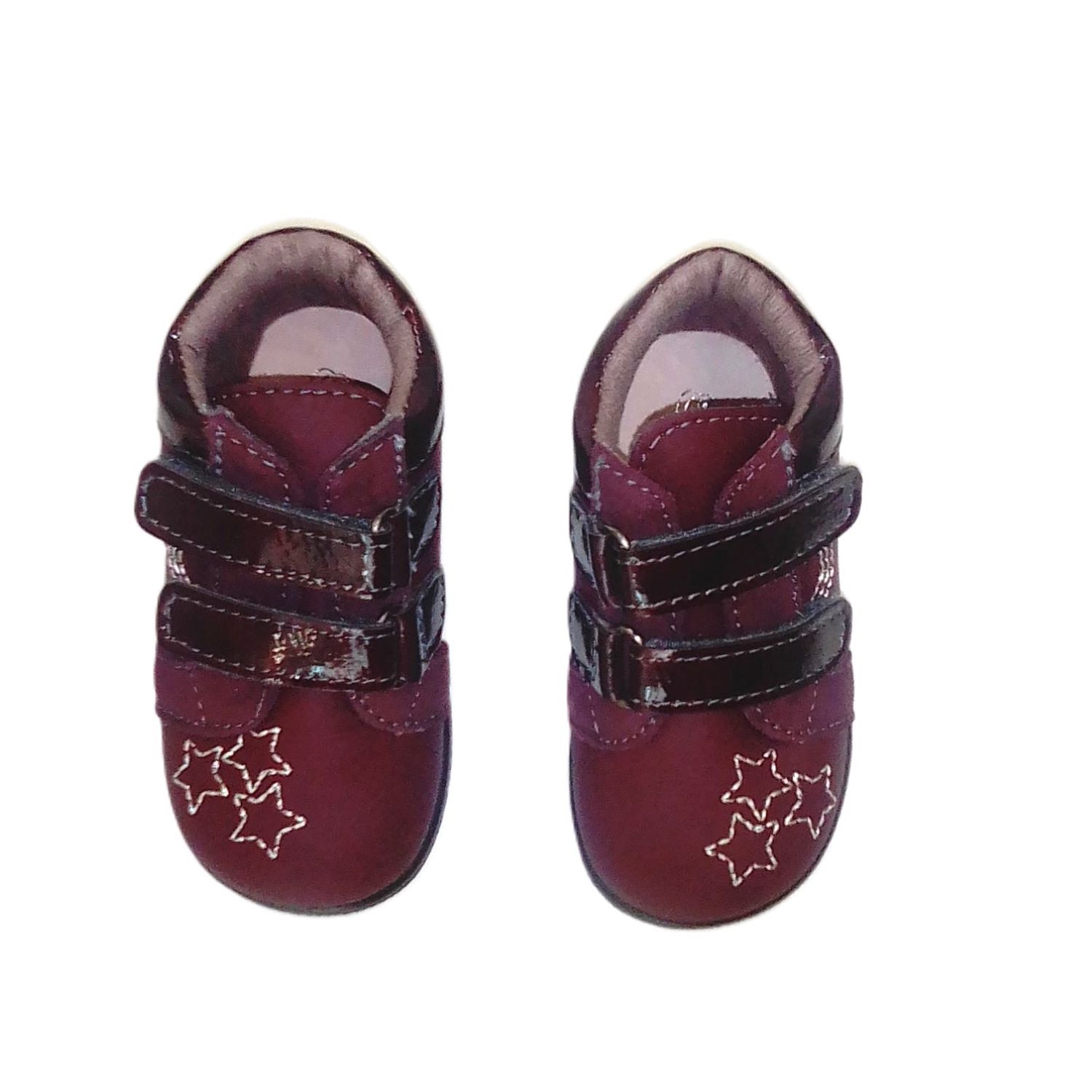 Botas en piel napa burdeos y burdeos metalizada con velcros, detalle de estrellas. Primeros pasos.