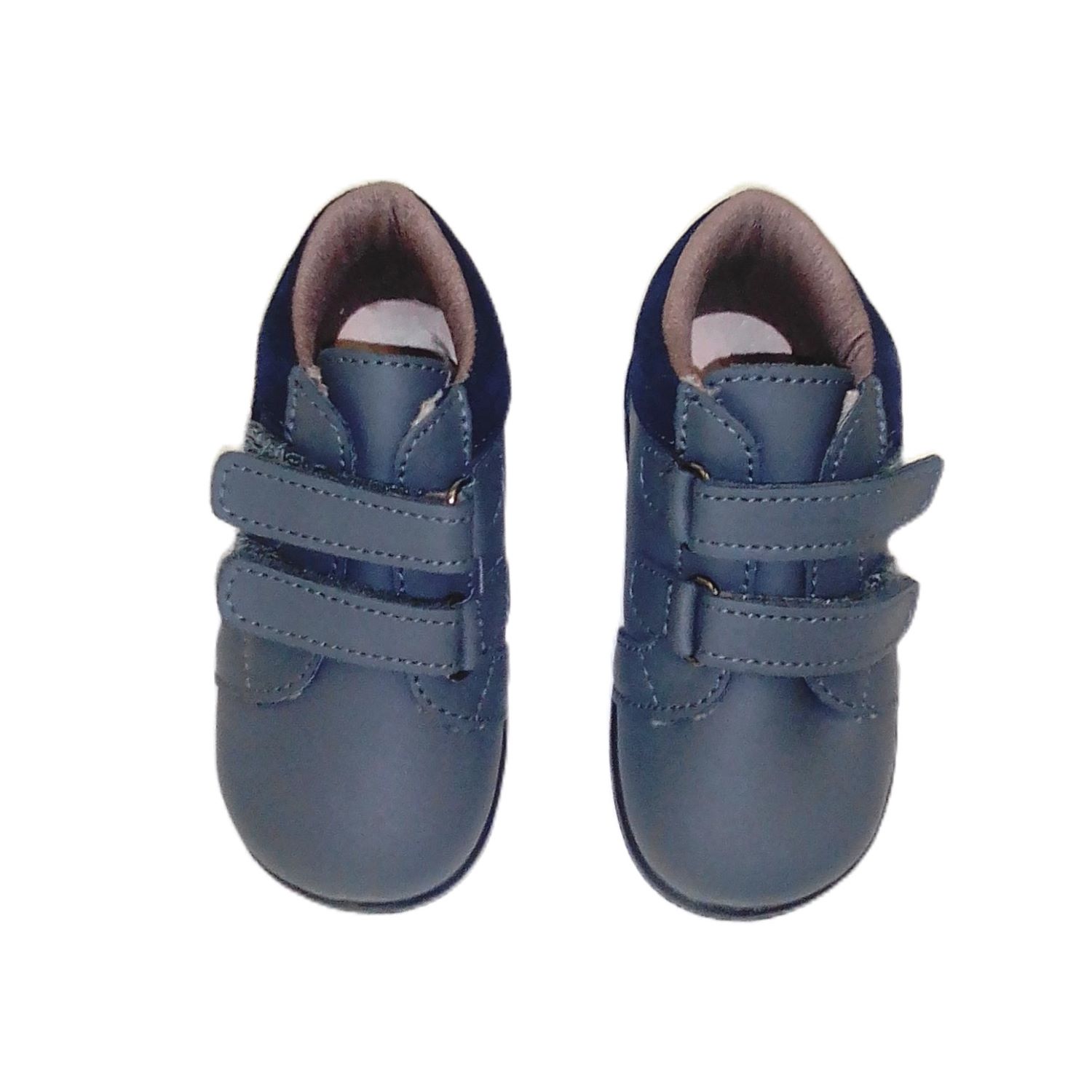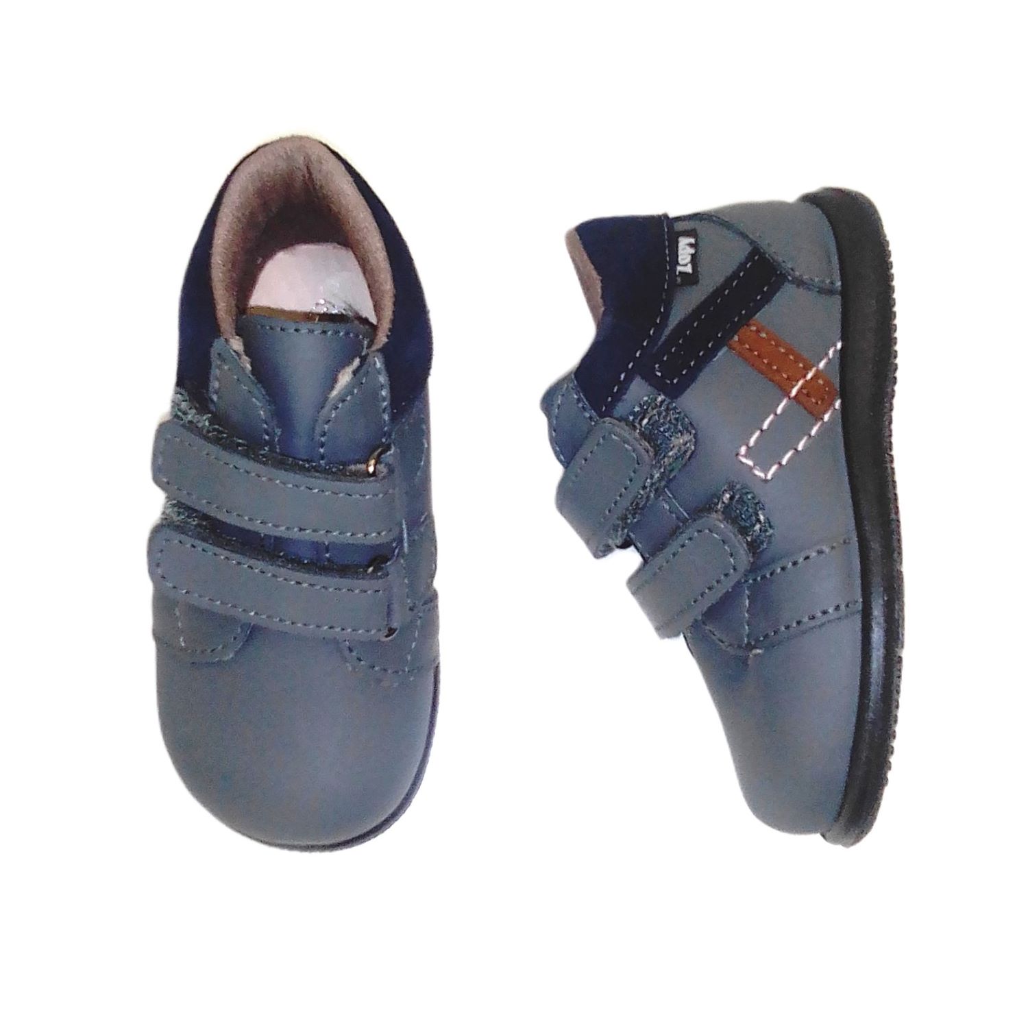 Botas en piel napa gris con detalle en serraje azul marino, gris y camel, con velcros. Primeros pasos.