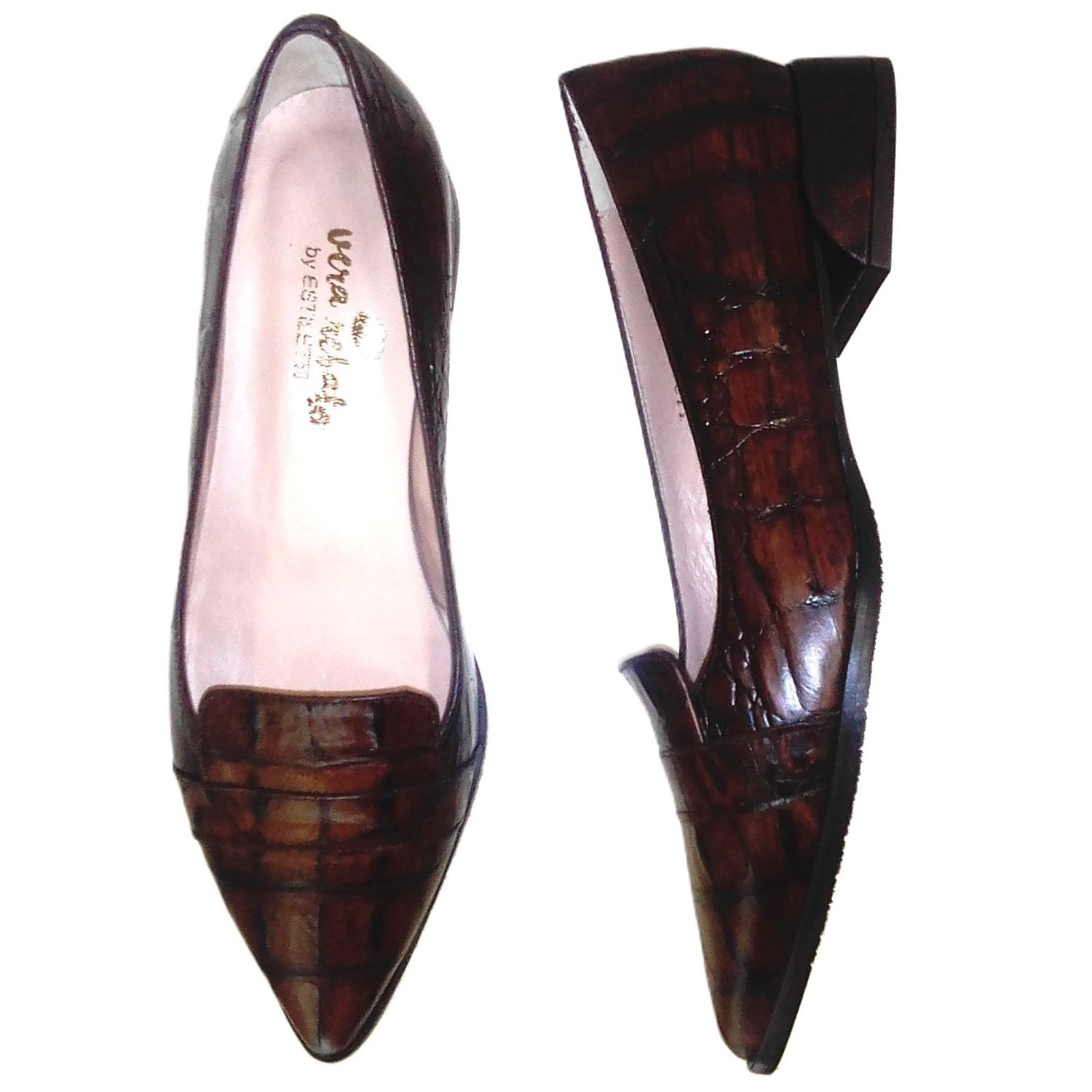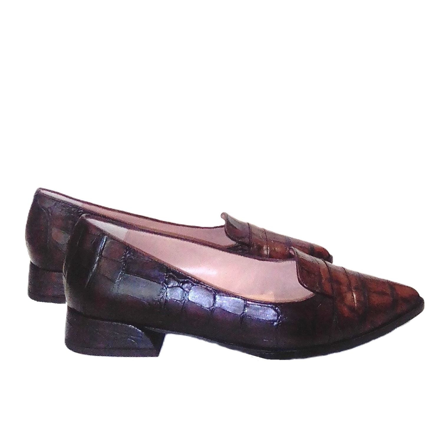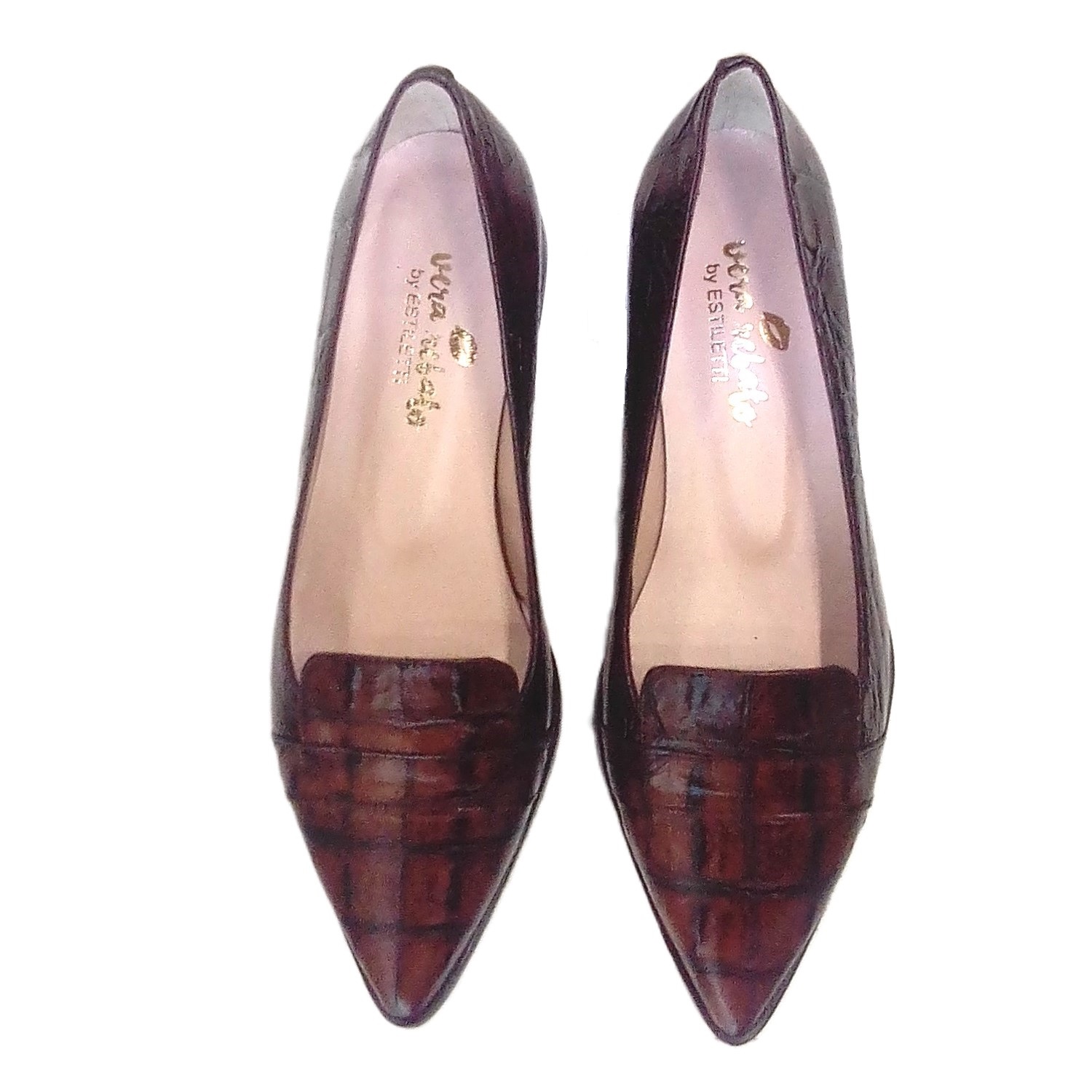 Zapato plano con copete y antifaz en piel coco marron marsala.