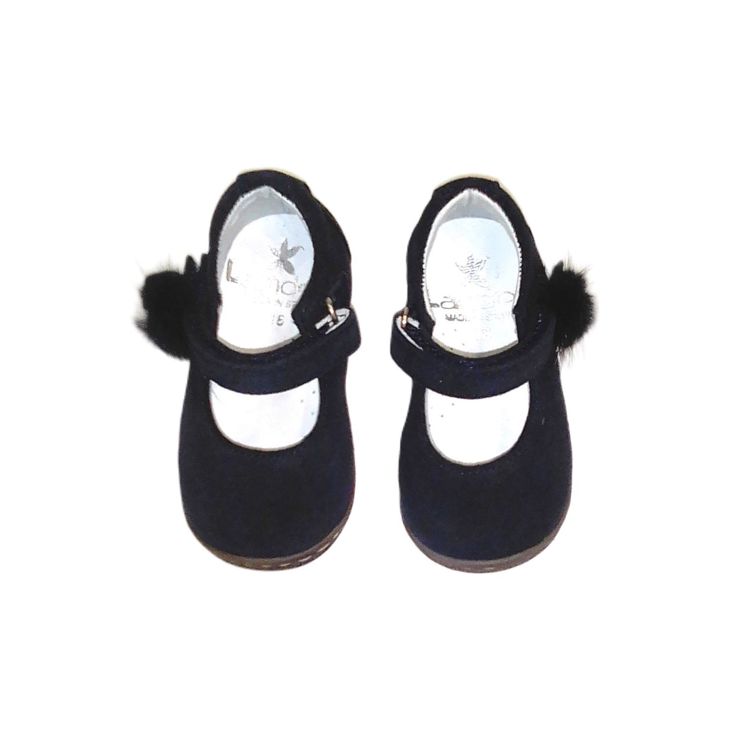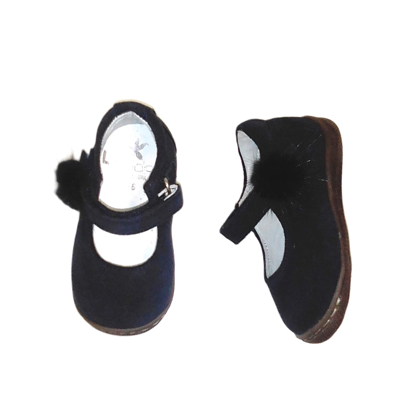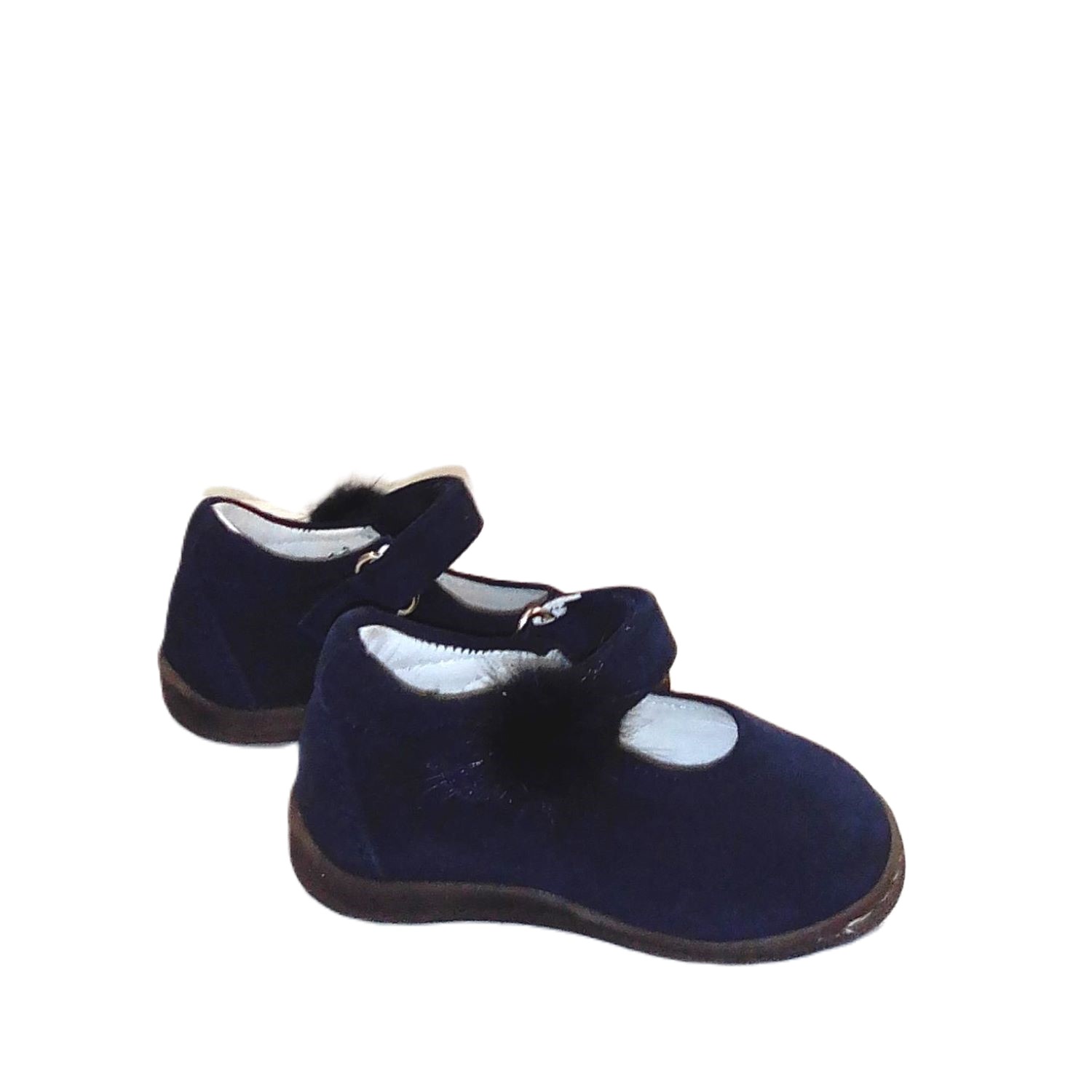 Mercedes en piel serraje hidrofugado azul marino. Piso de goma con refuerzo en la puntera y en la talonera. Con velcro y pompon de vison.