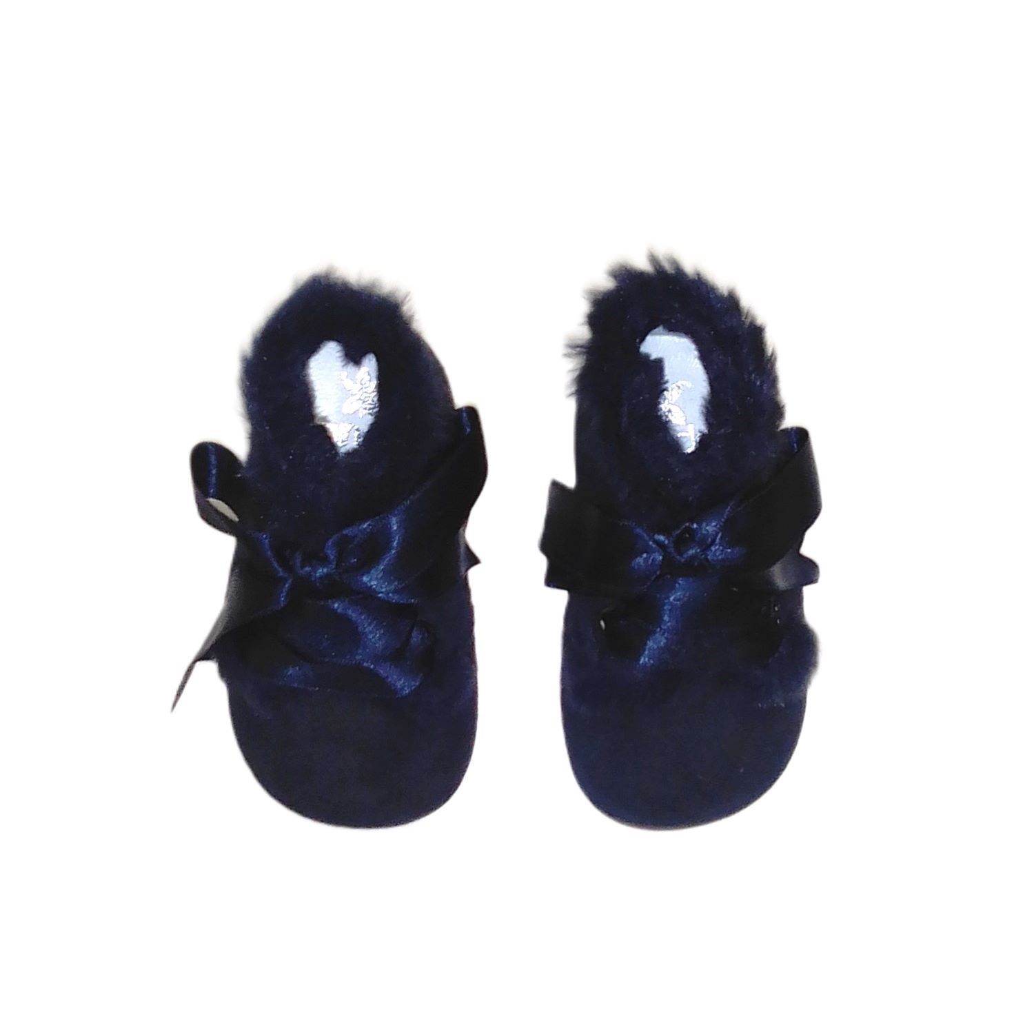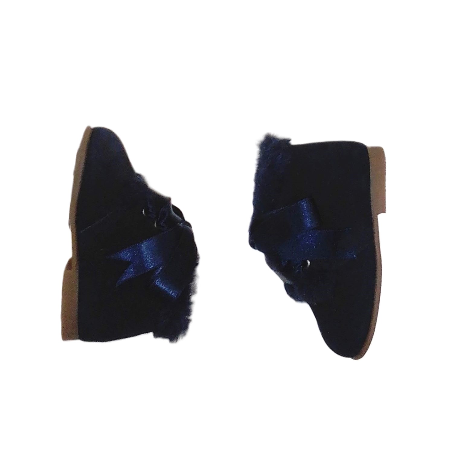 Botas en piel serraje hidrofugado en color azul marino. Detalle de pelito de vison en el cuello. Con cordones normales y cordones de raso.