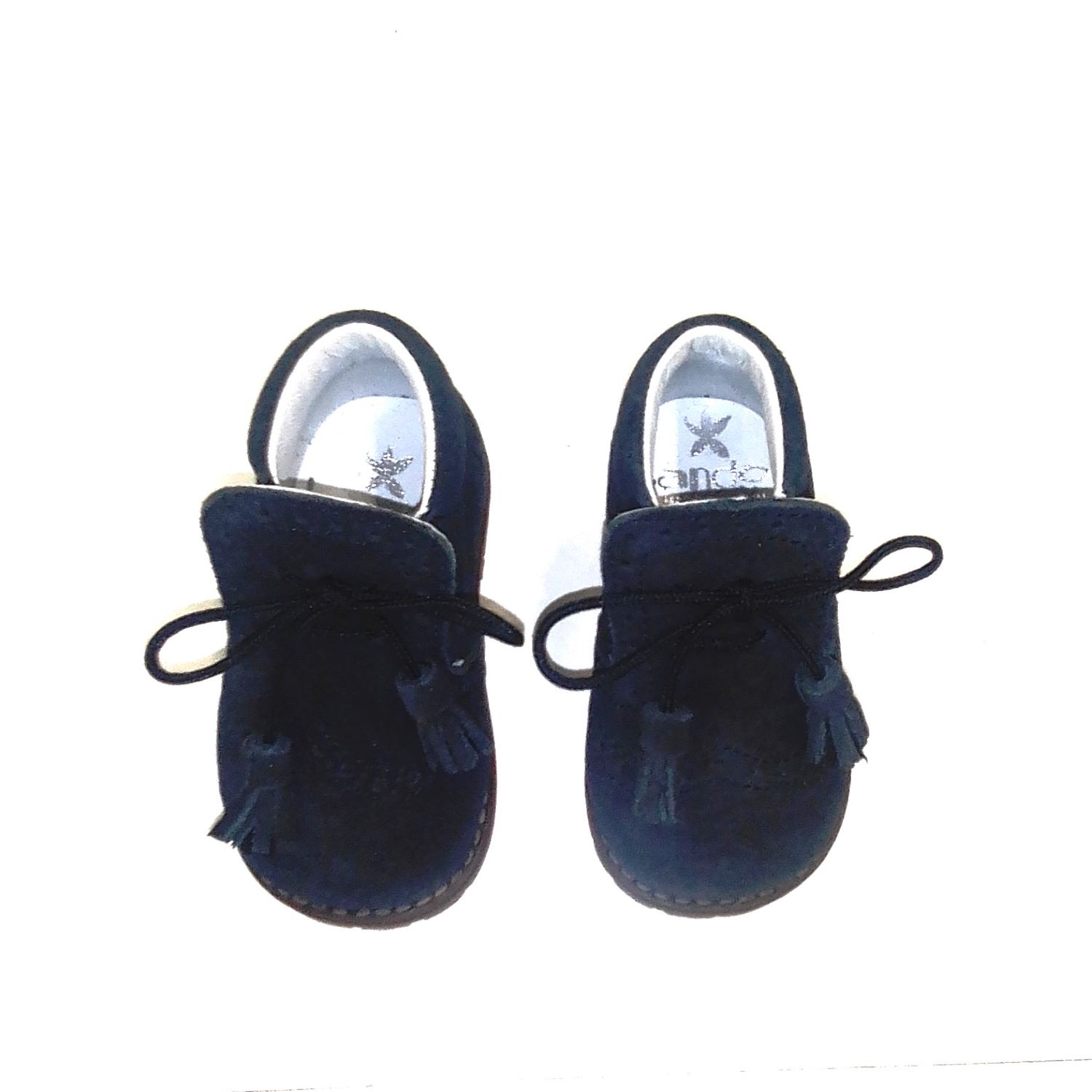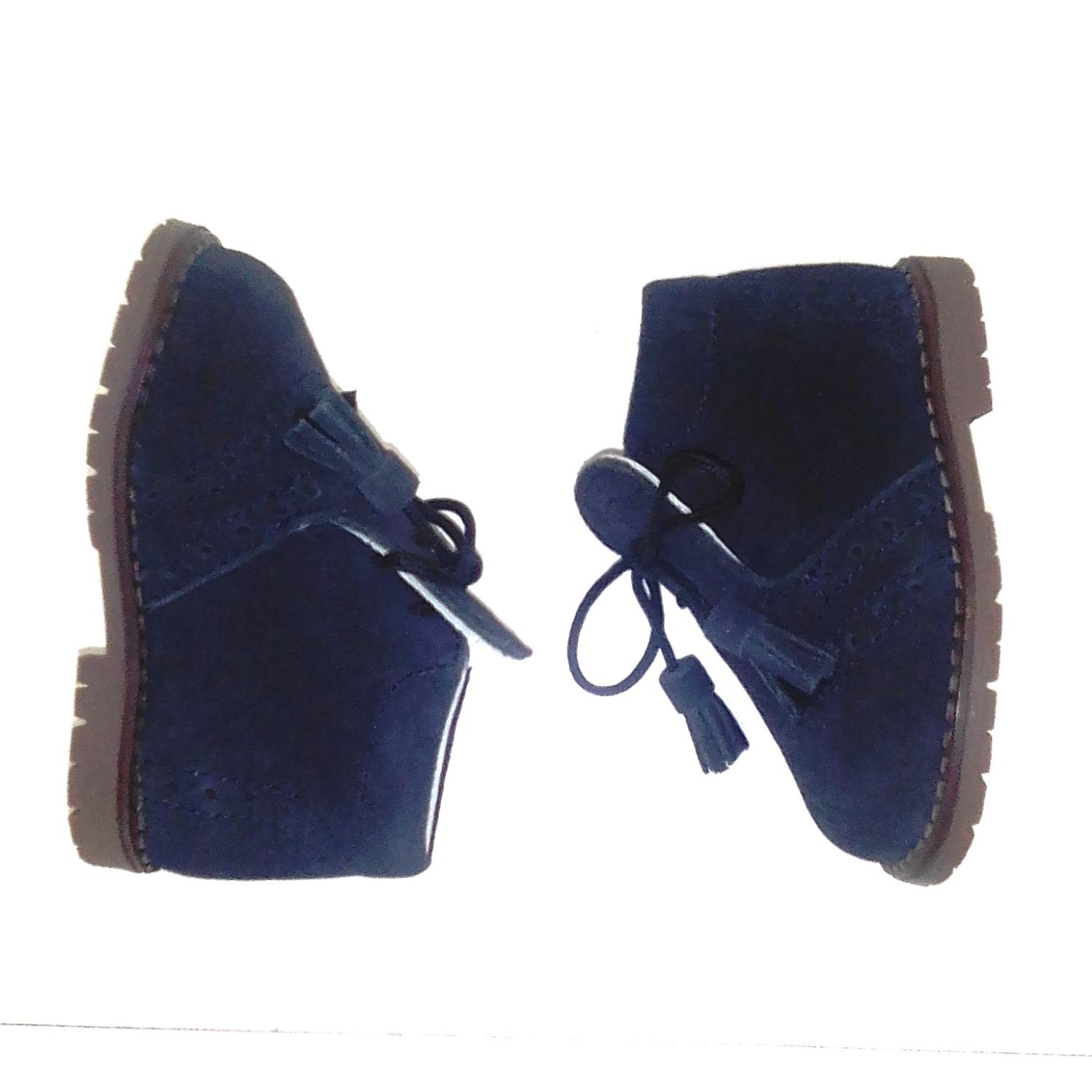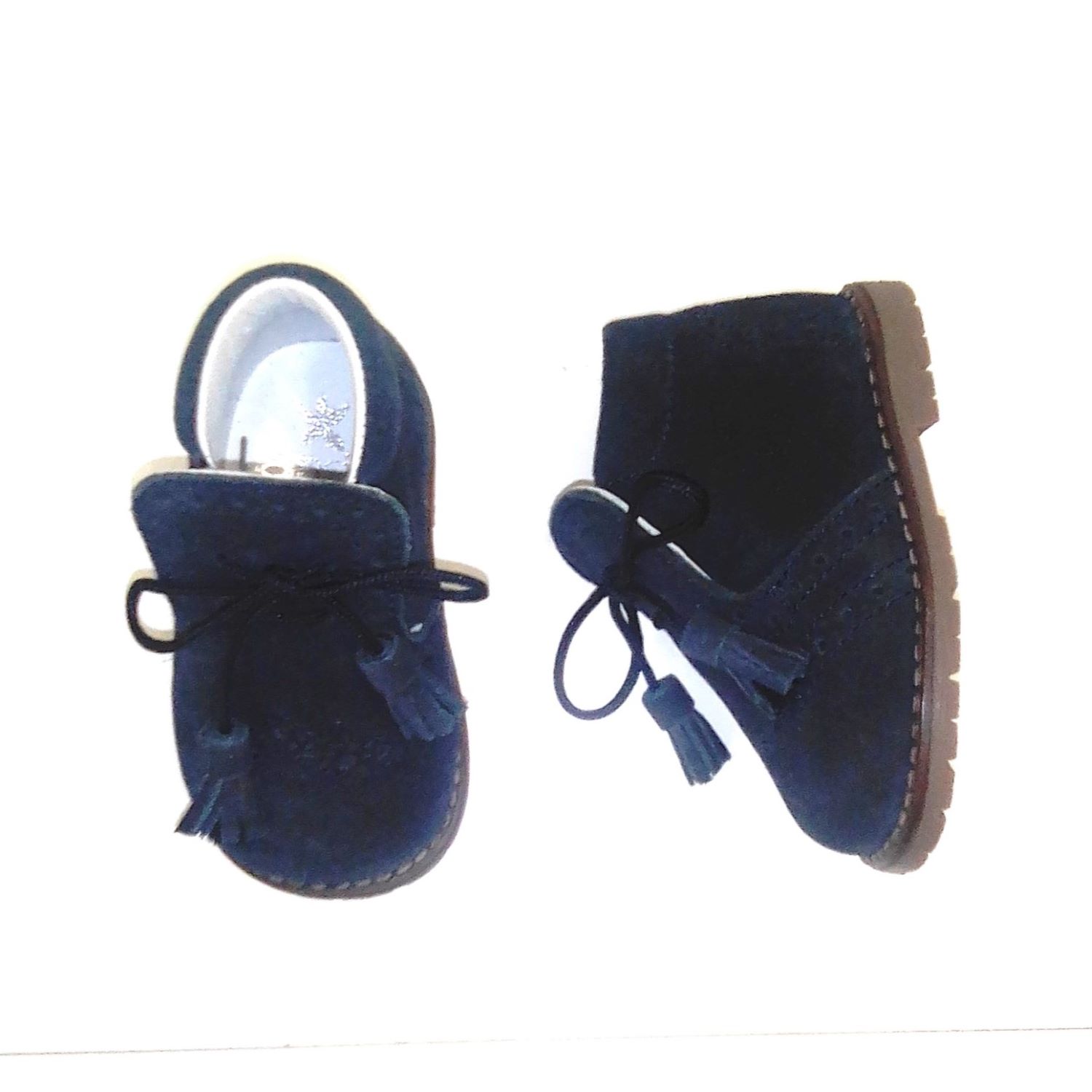 Botas en piel serraje hidrofugado en color azul marino. Detalle de picado ingles. Con cordones que terminan en borlas y piso mastin.