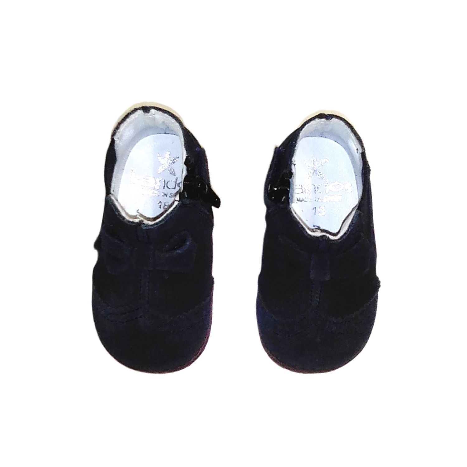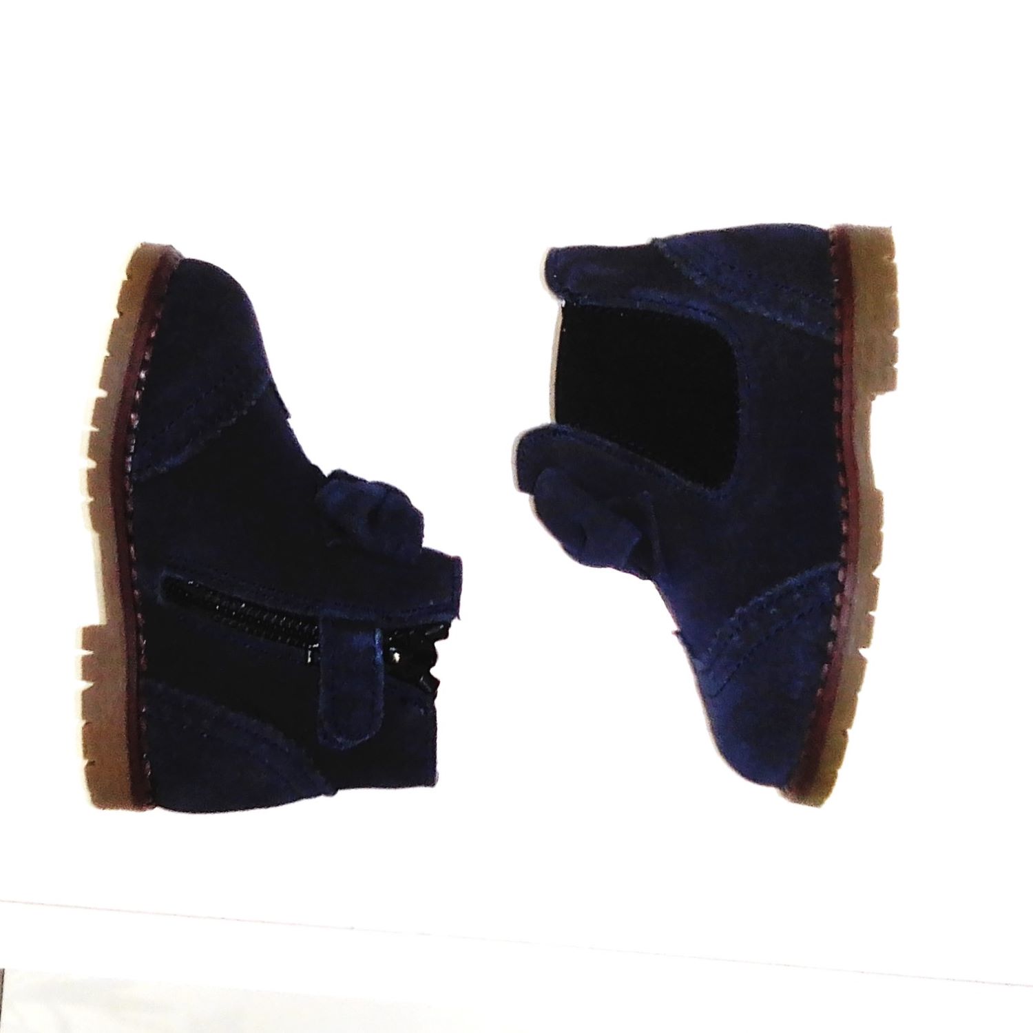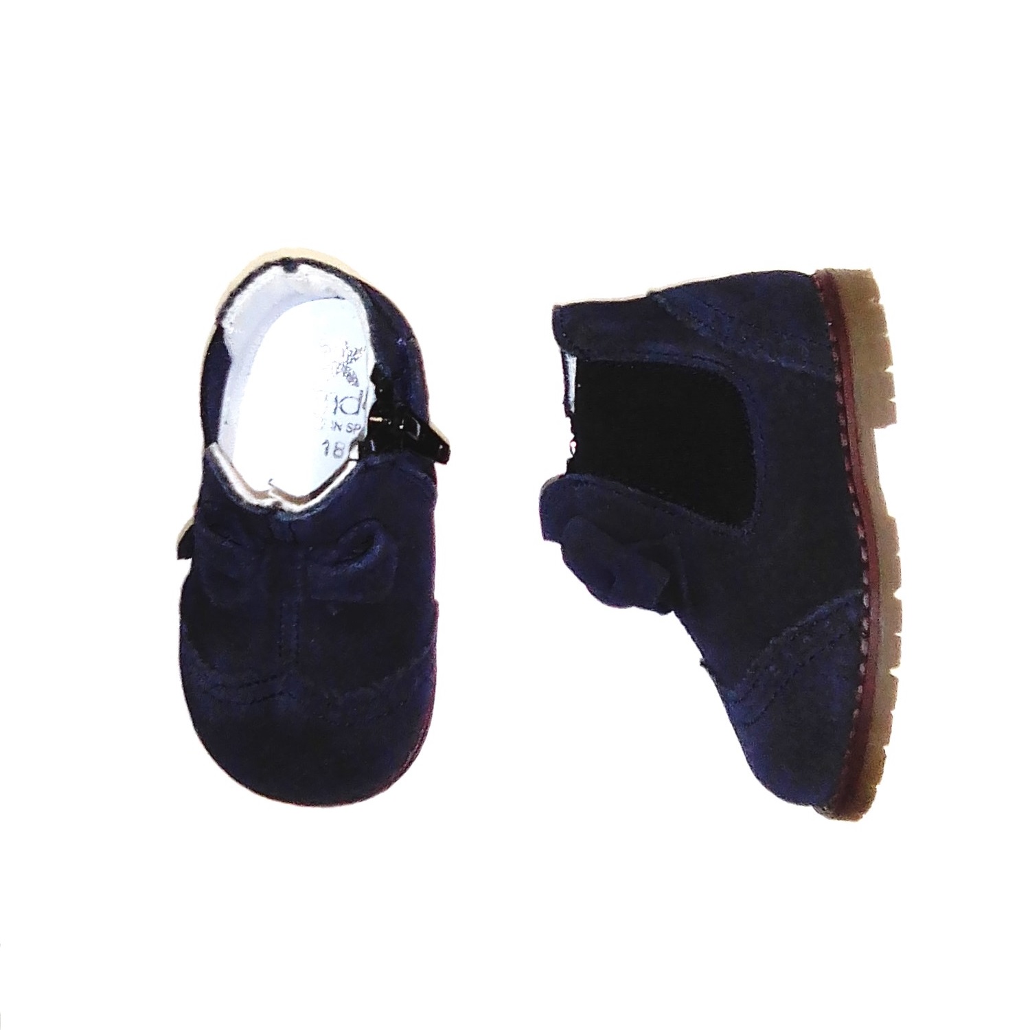 Botas en piel serraje hidrofugado en color azul marino. Detalle de picado ingles y lazo de la misma piel. Con cremallera y piso mastin.