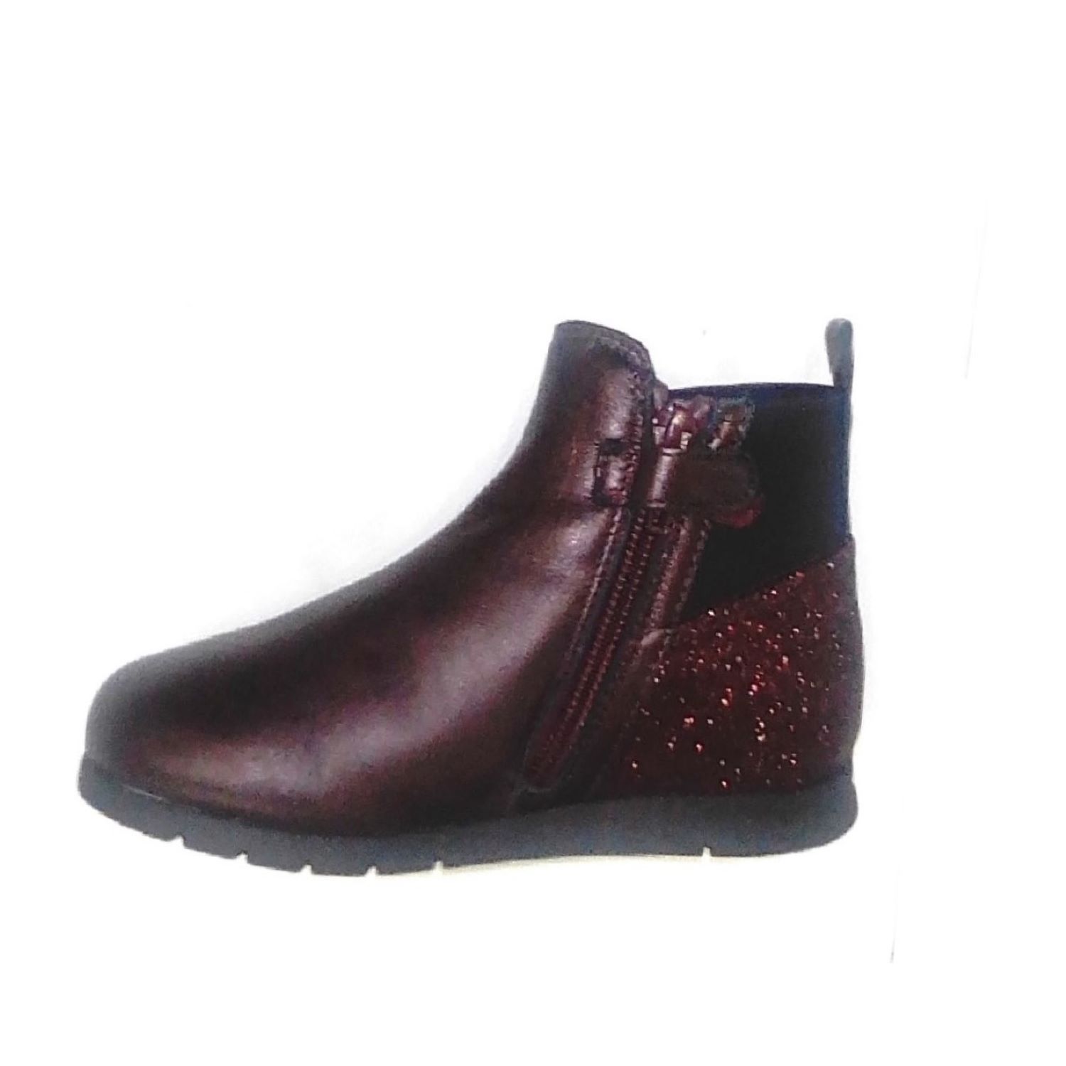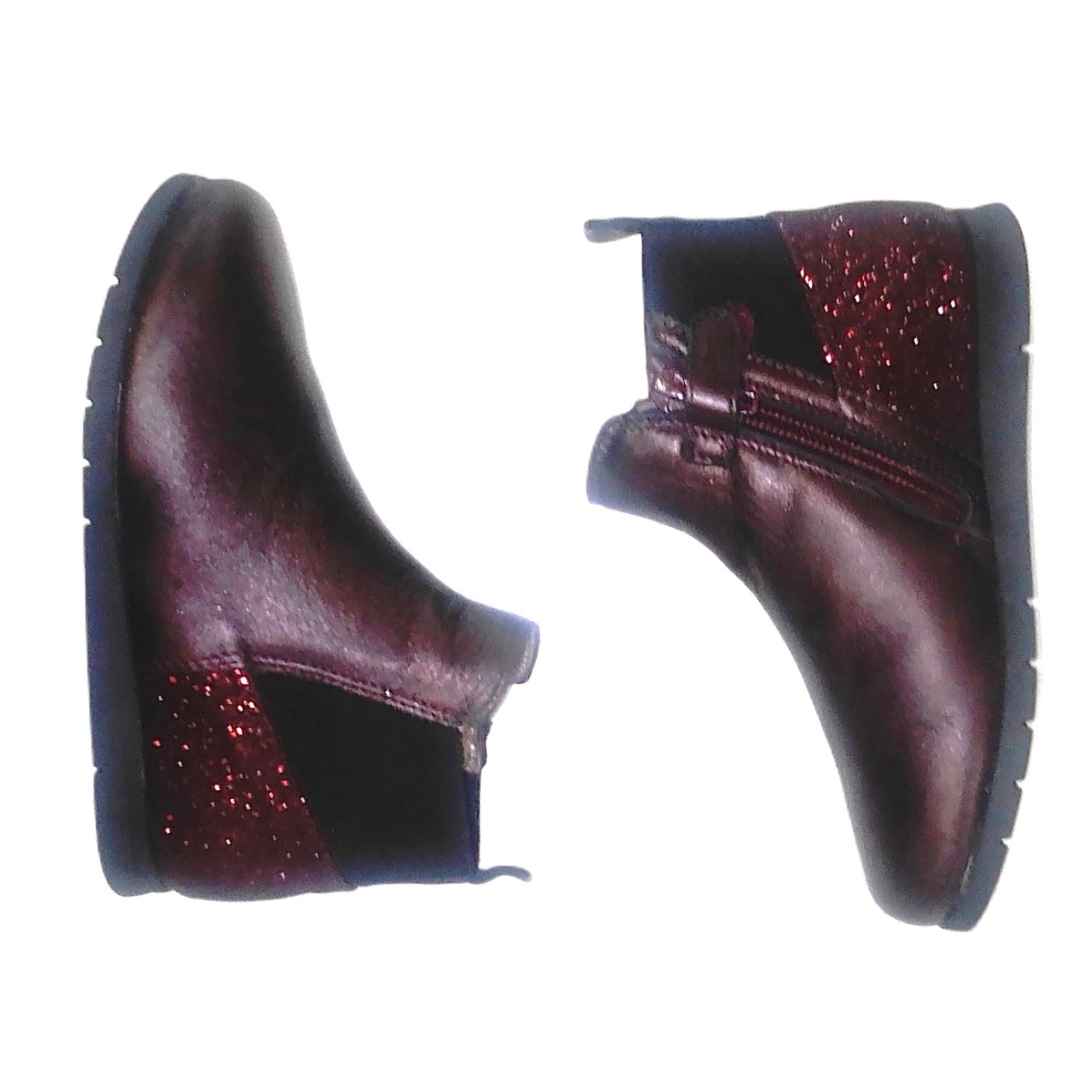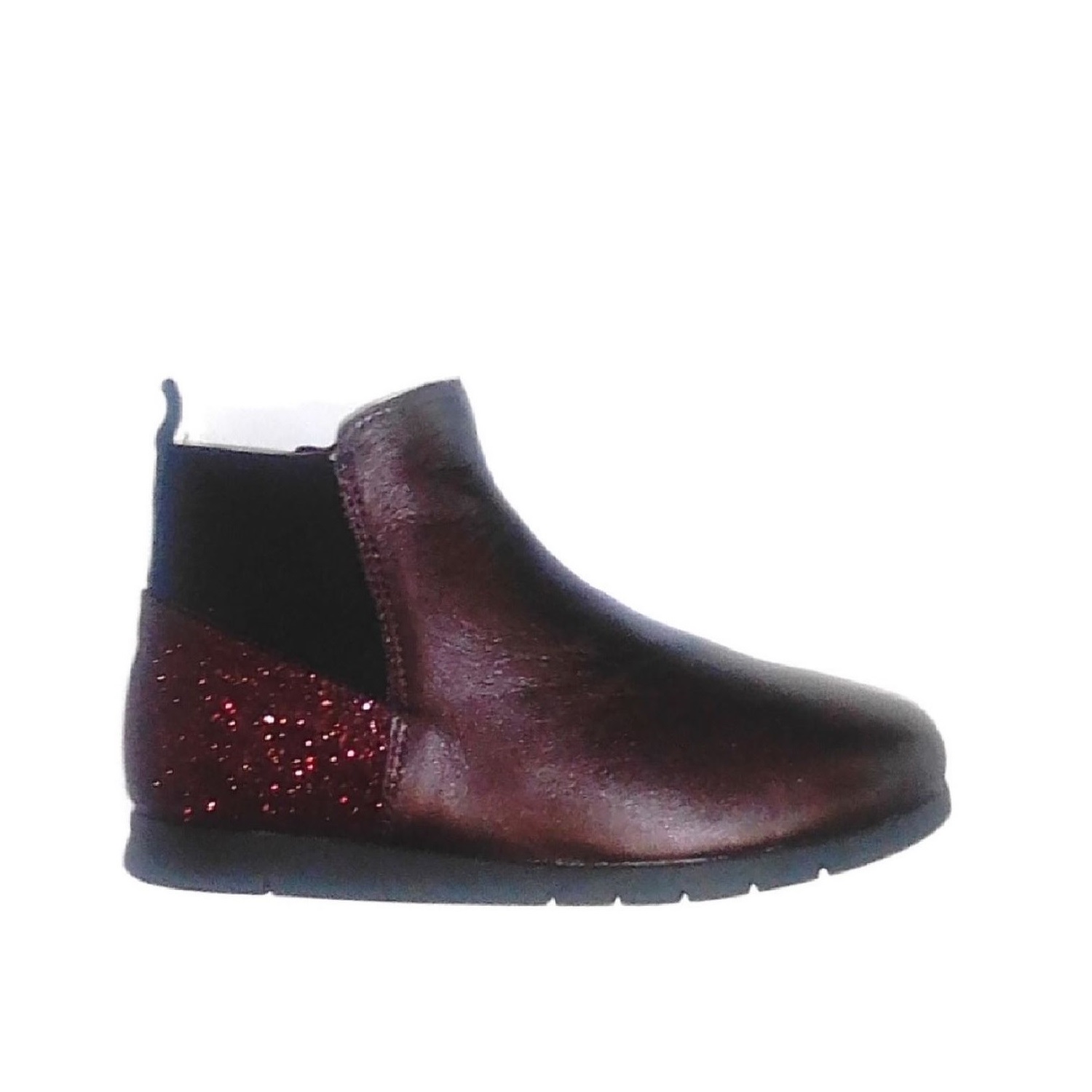 Bota corta en piel napa metalizada burdeos. Detalle de gliter burdeos en la talonera. Con cremallera