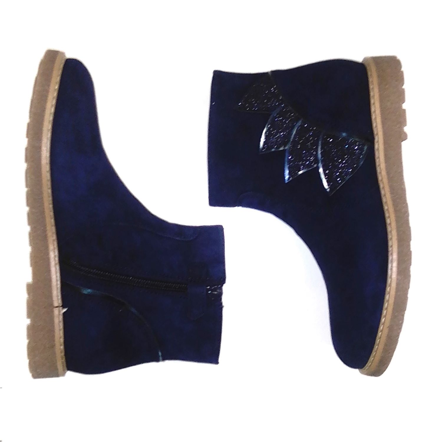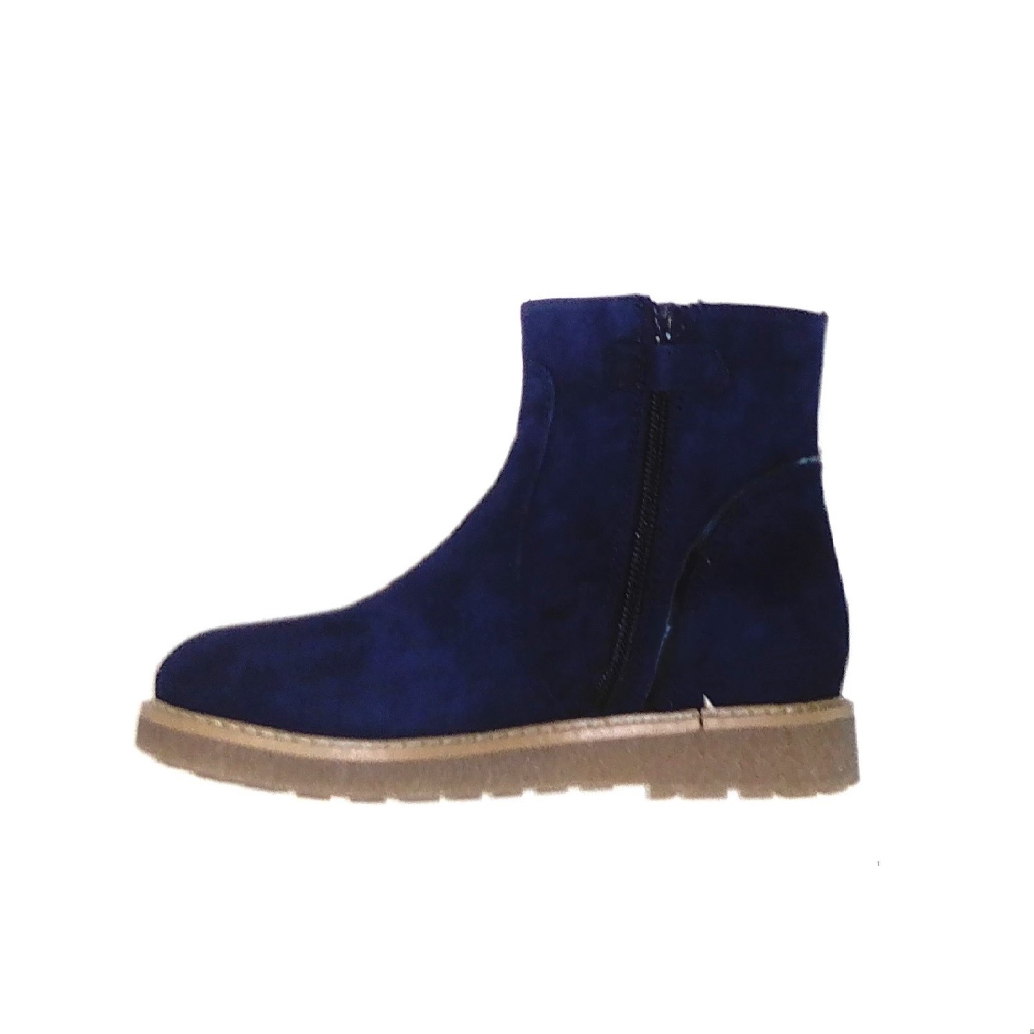 Bota corta en piel ante azul. Detalle de gliter azul en la talonera. Con cremallera, Suela de crepe.