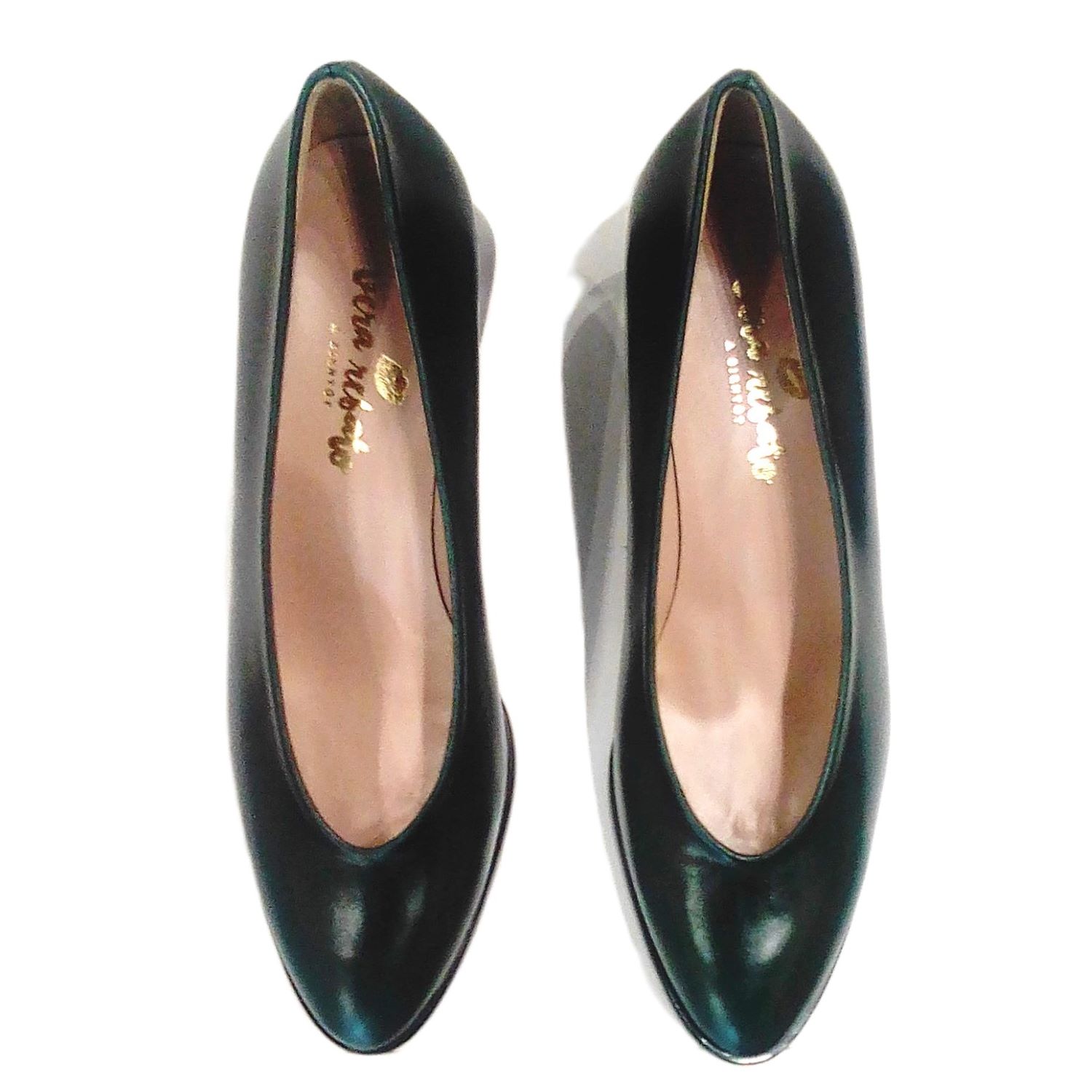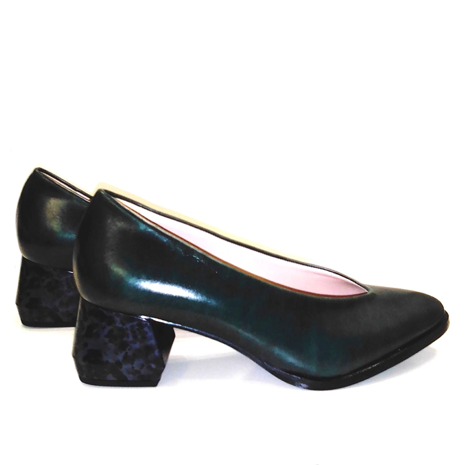 Zapato de tacon en piel napa verde. Tacon ancho y efecto calidoscopio.