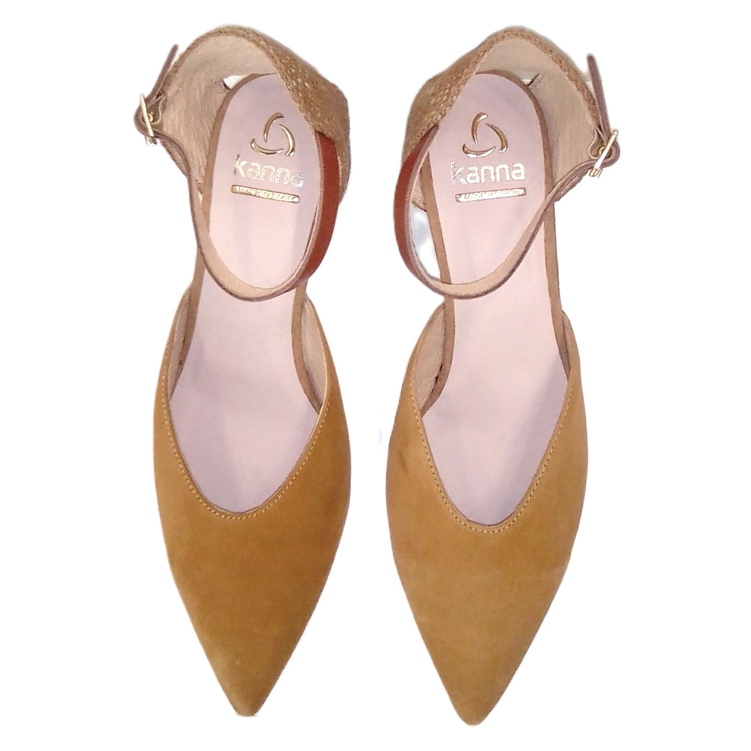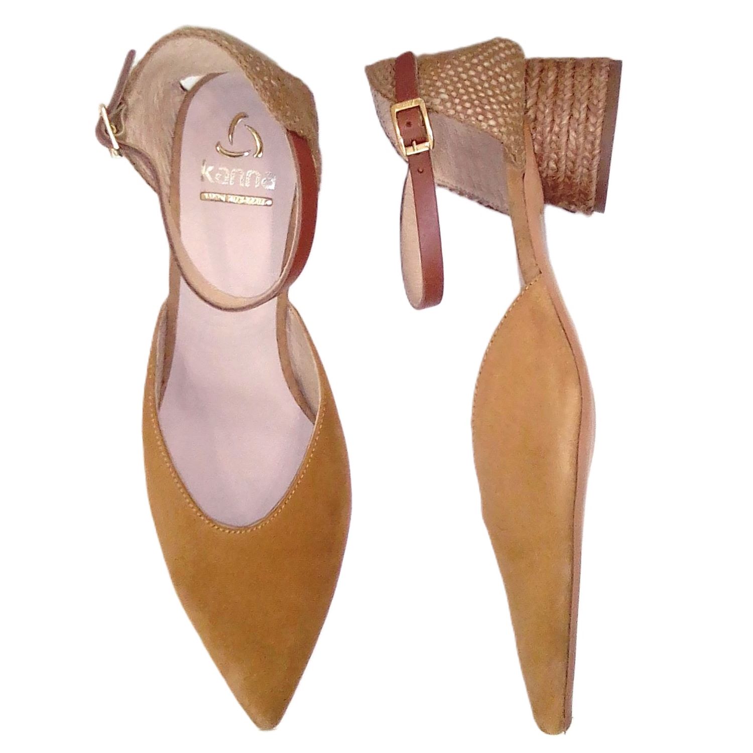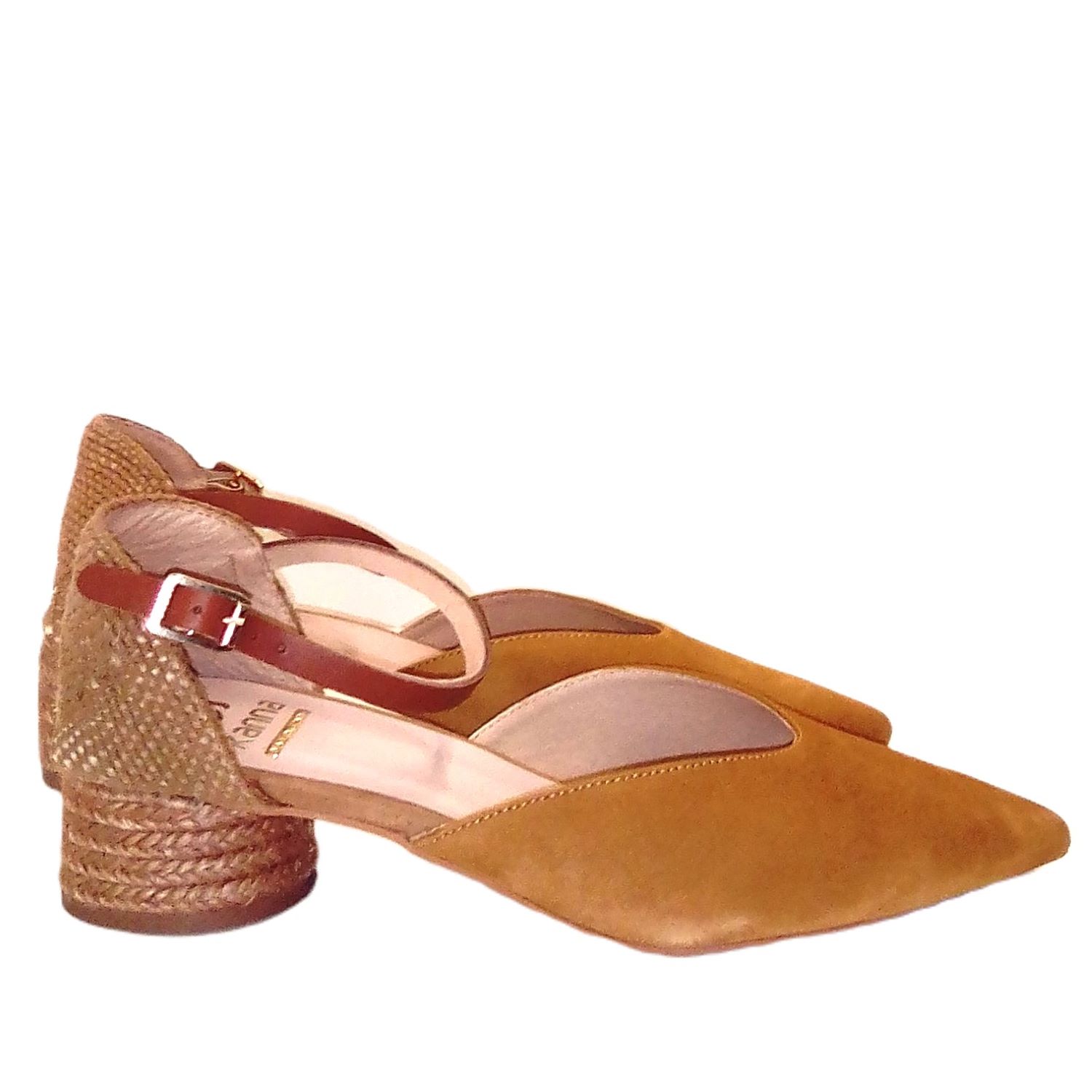 Zapato de tacon bajo con pulsera en ante camel, estilo boho. El tacon es redondo y forrado en yute o cuerda.