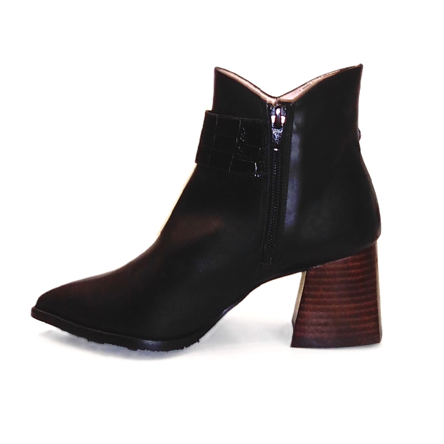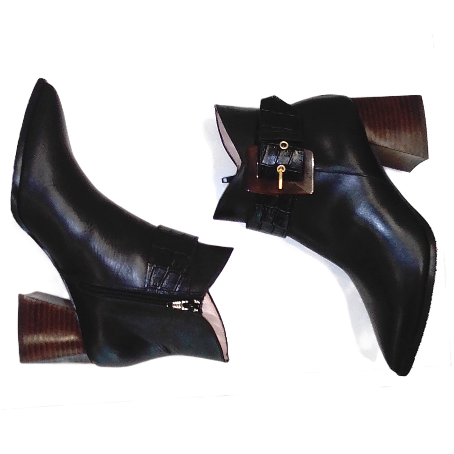 Botin en piel napa negra. Con cremallera interior. Detalle de hebilla tipo carey y cinturon en piel estampada coco negra.