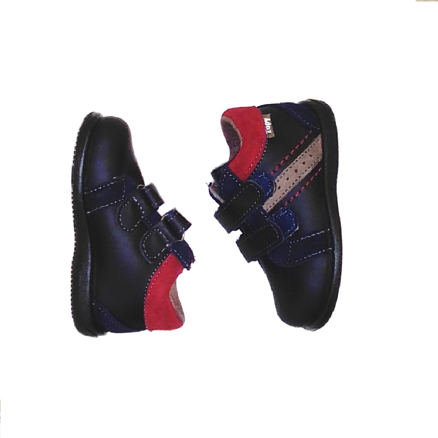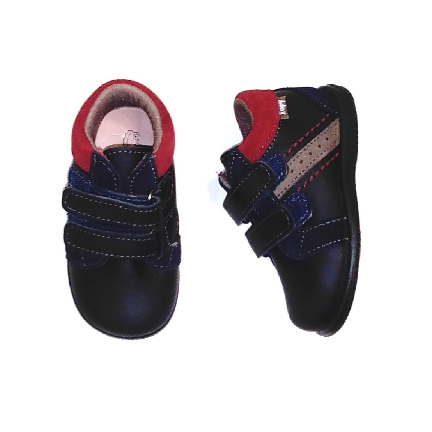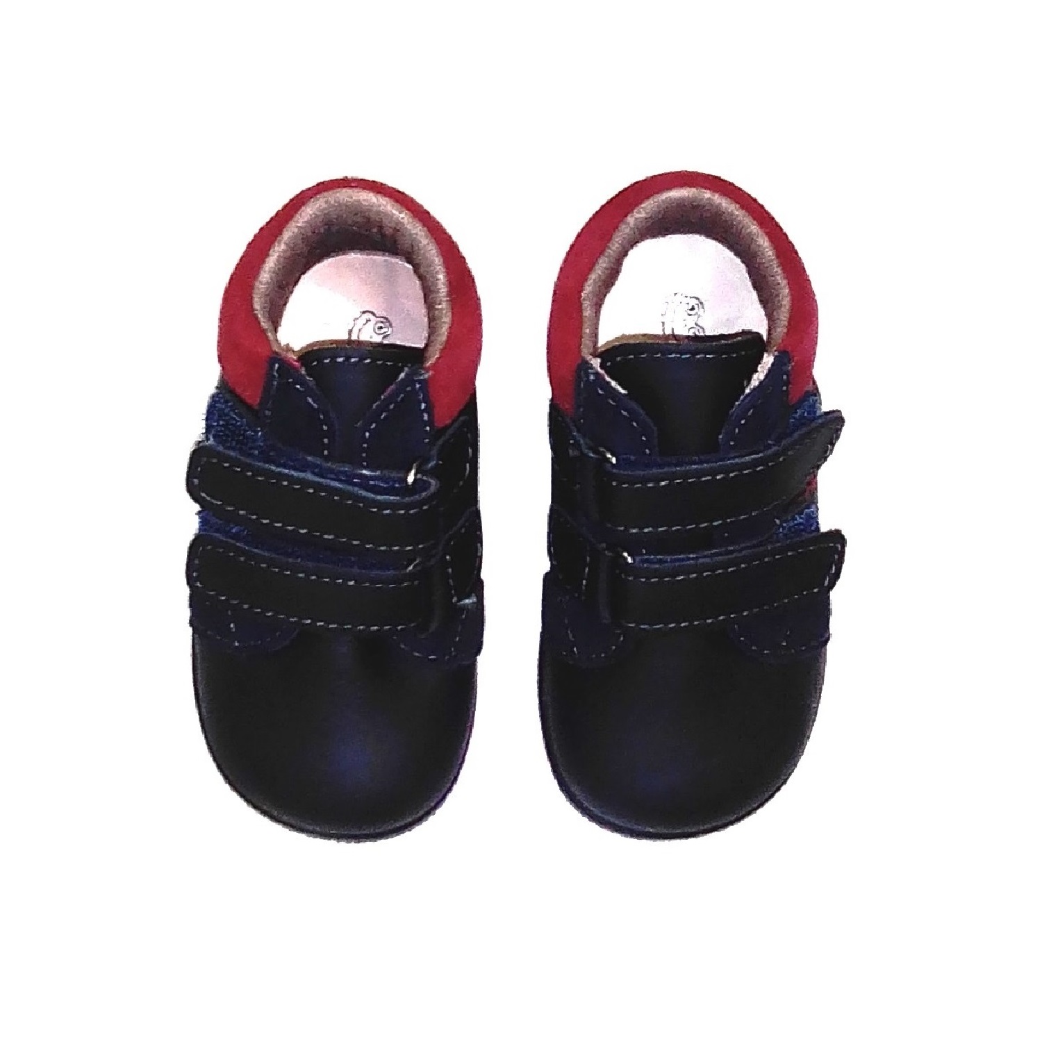 Botas en piel napa azul marino con detalle en serraje rojo y camel, con velcros. Primeros pasos.