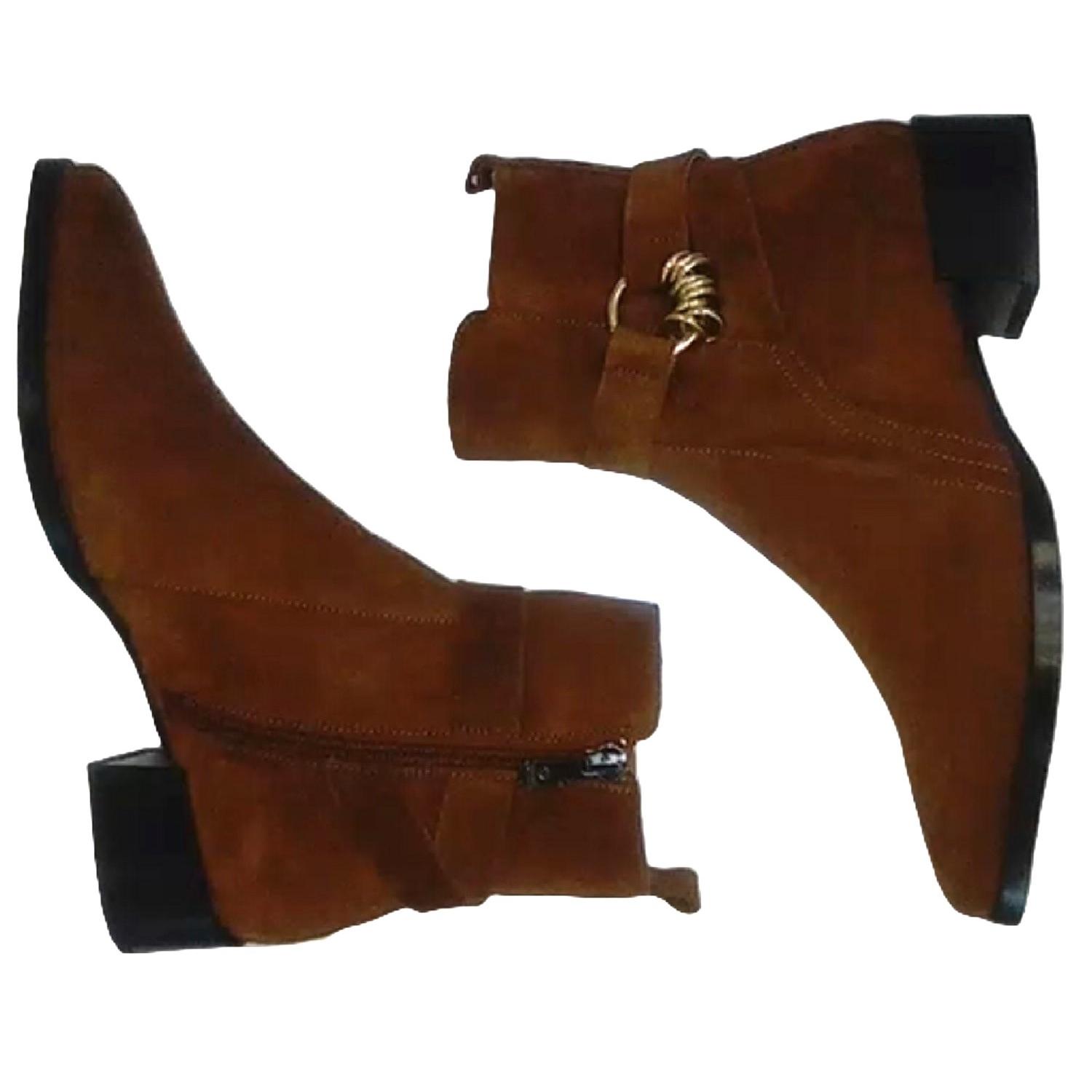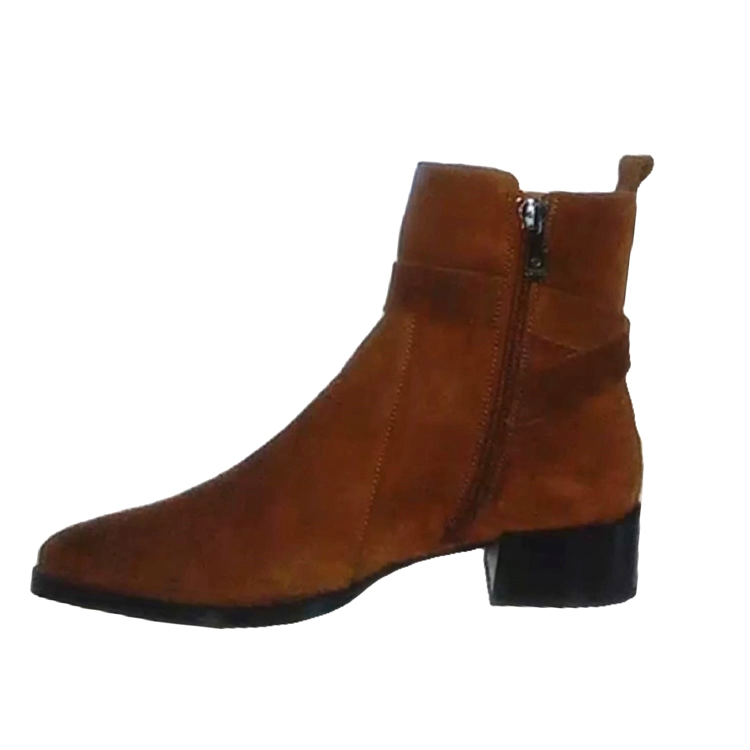 Botin en piel serraje color whisky. Se abrocha con la cremallera interior. Detalle de arandelas en el tobillo exterior.