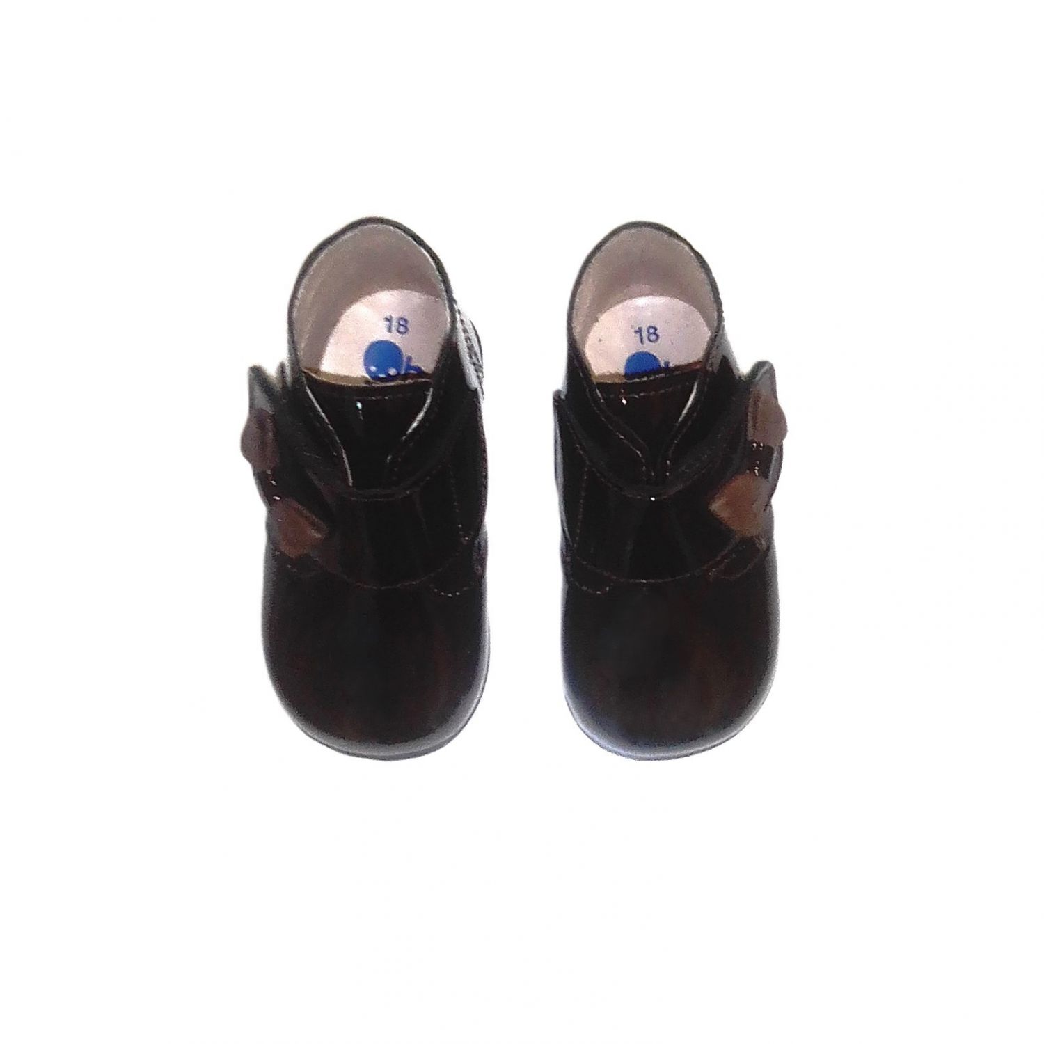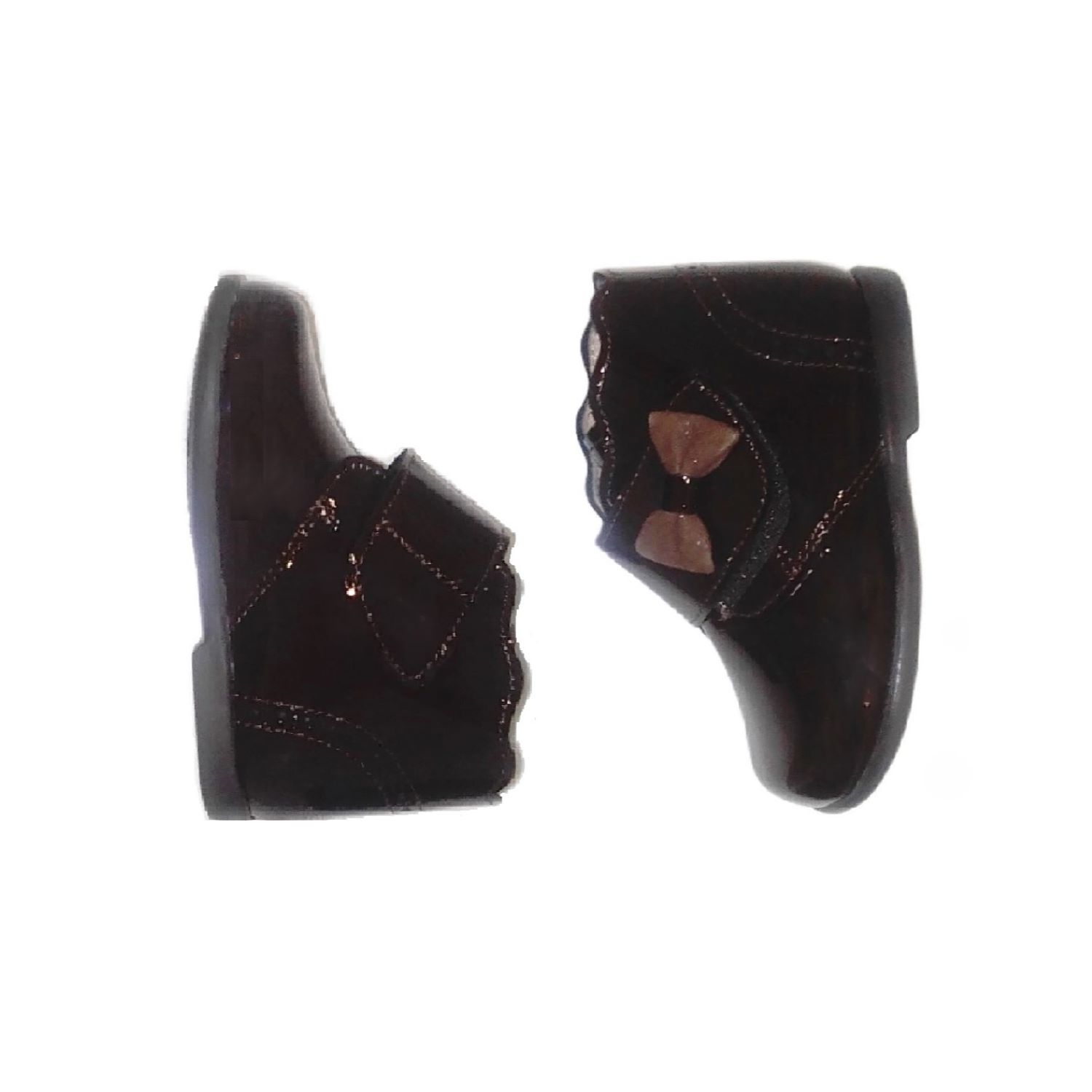 Botas en piel acharolada marron chocolate. Detalle de lazo en piel metalizada marron. Con velcro.