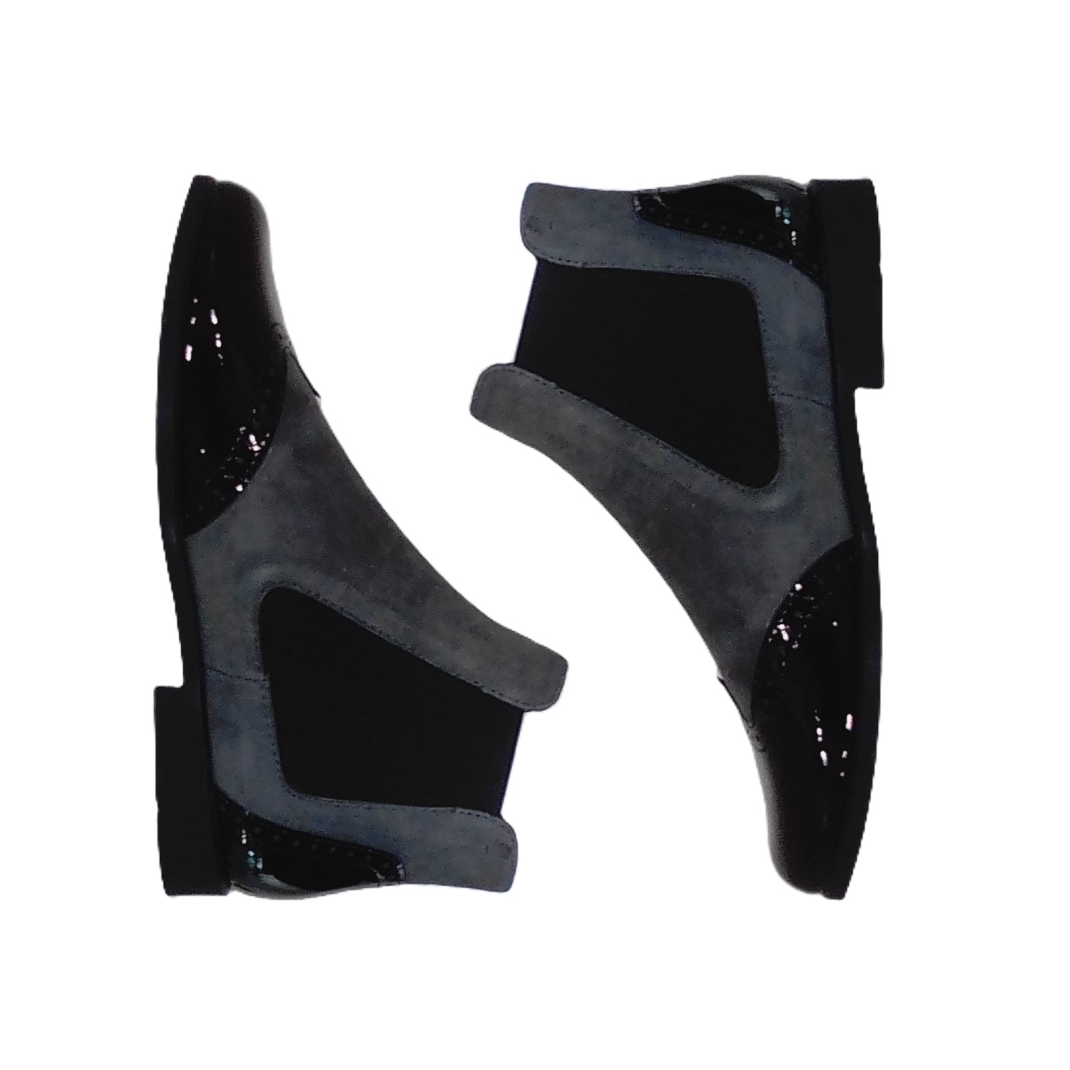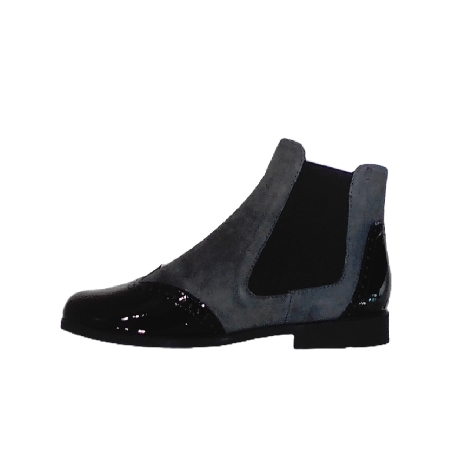 Botin con elasticos en piel ante gris y detalles en piel acharolada negra, de estilo ingles con picados.