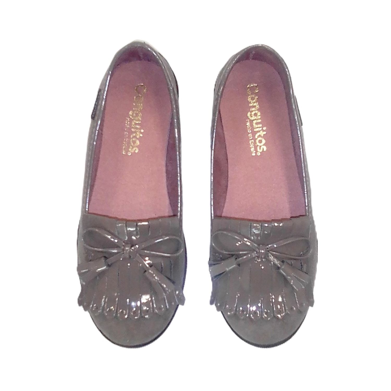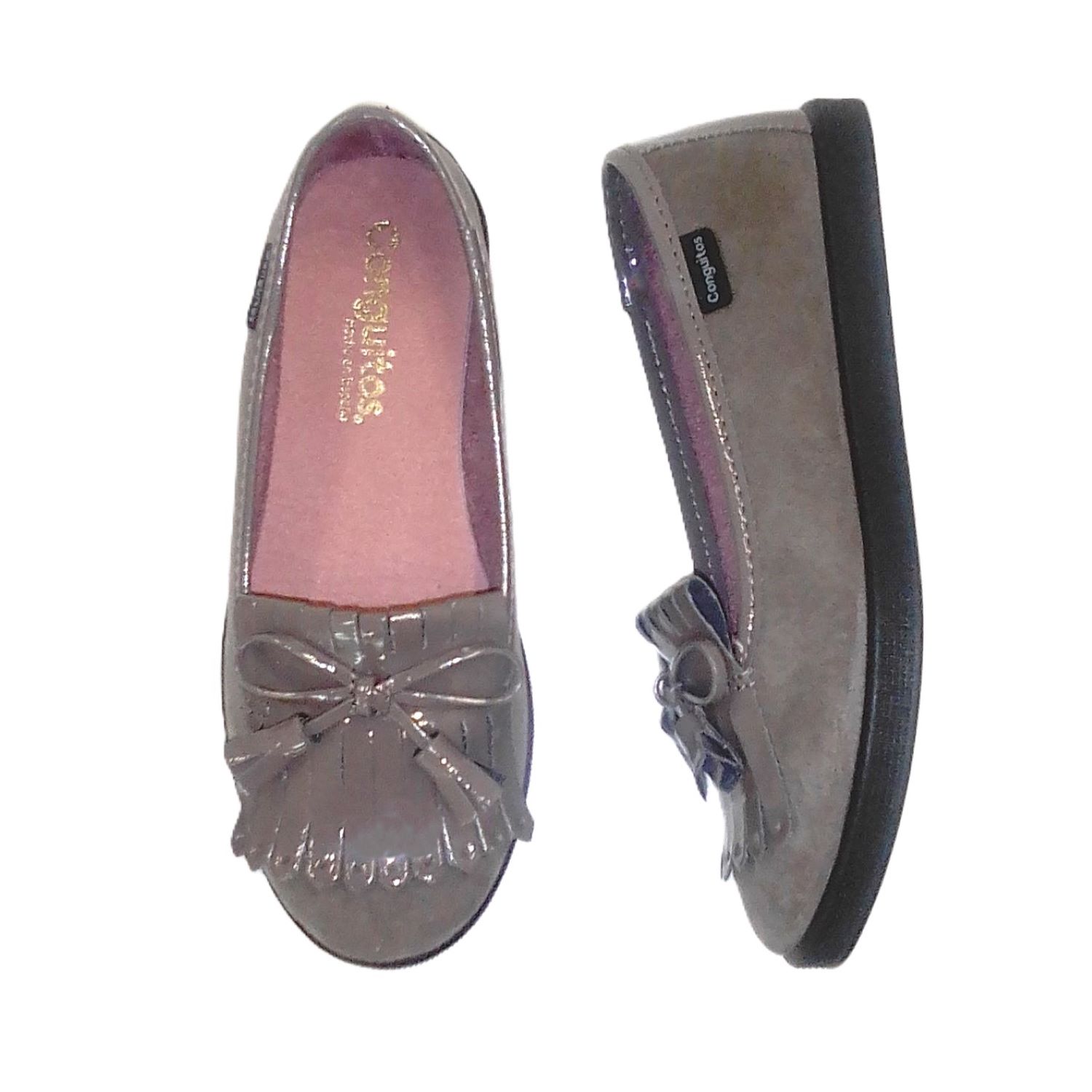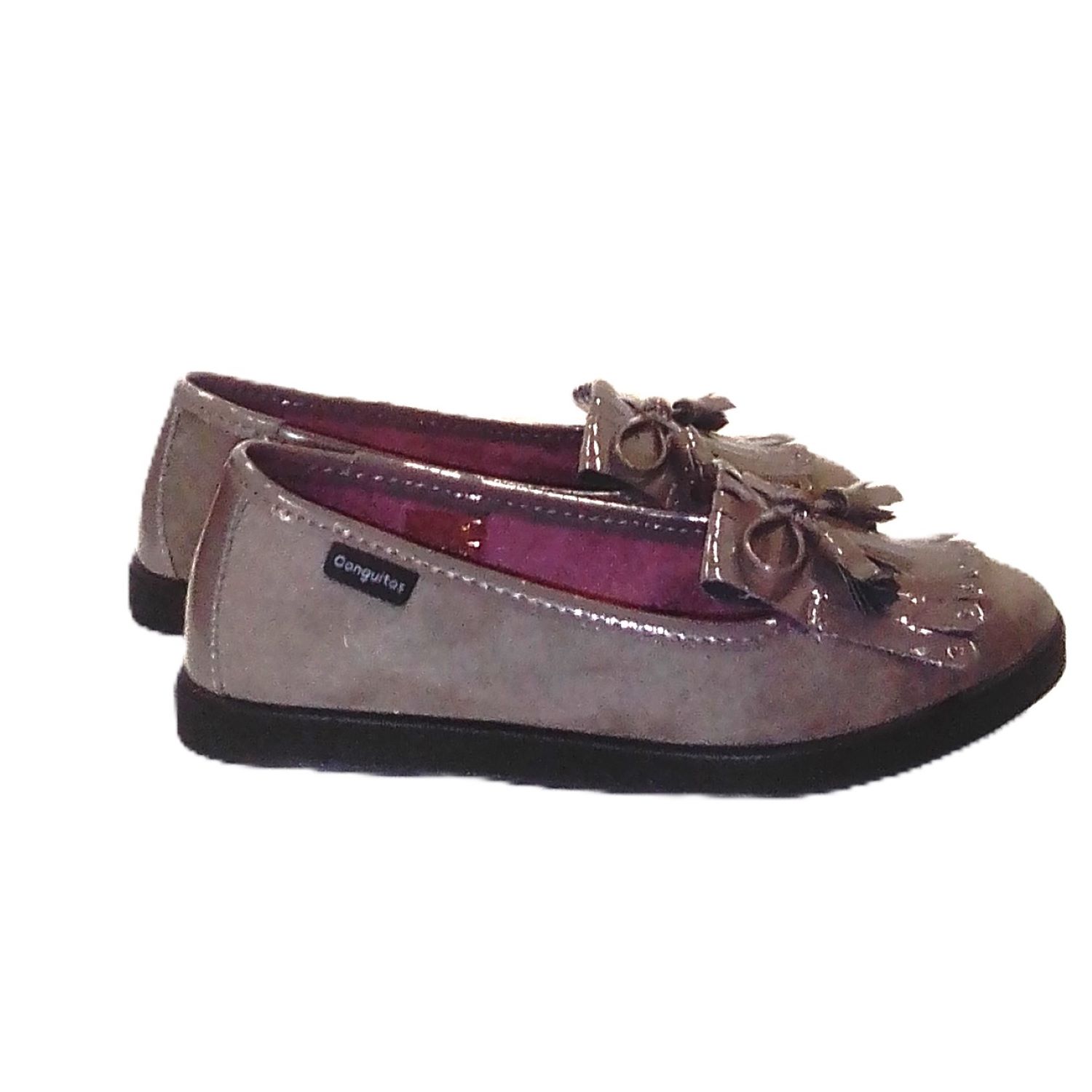 Zapatos en serratech taupe, con lazo que termina con 2 borlas. Efecto ante y charol. Suela muy flexible