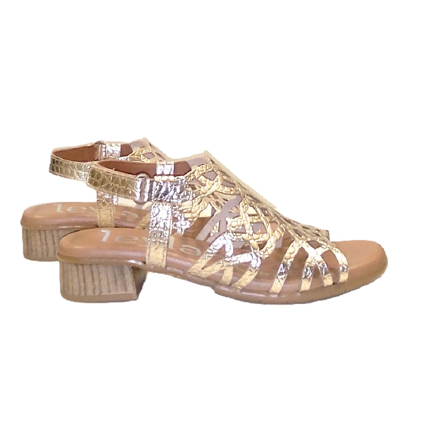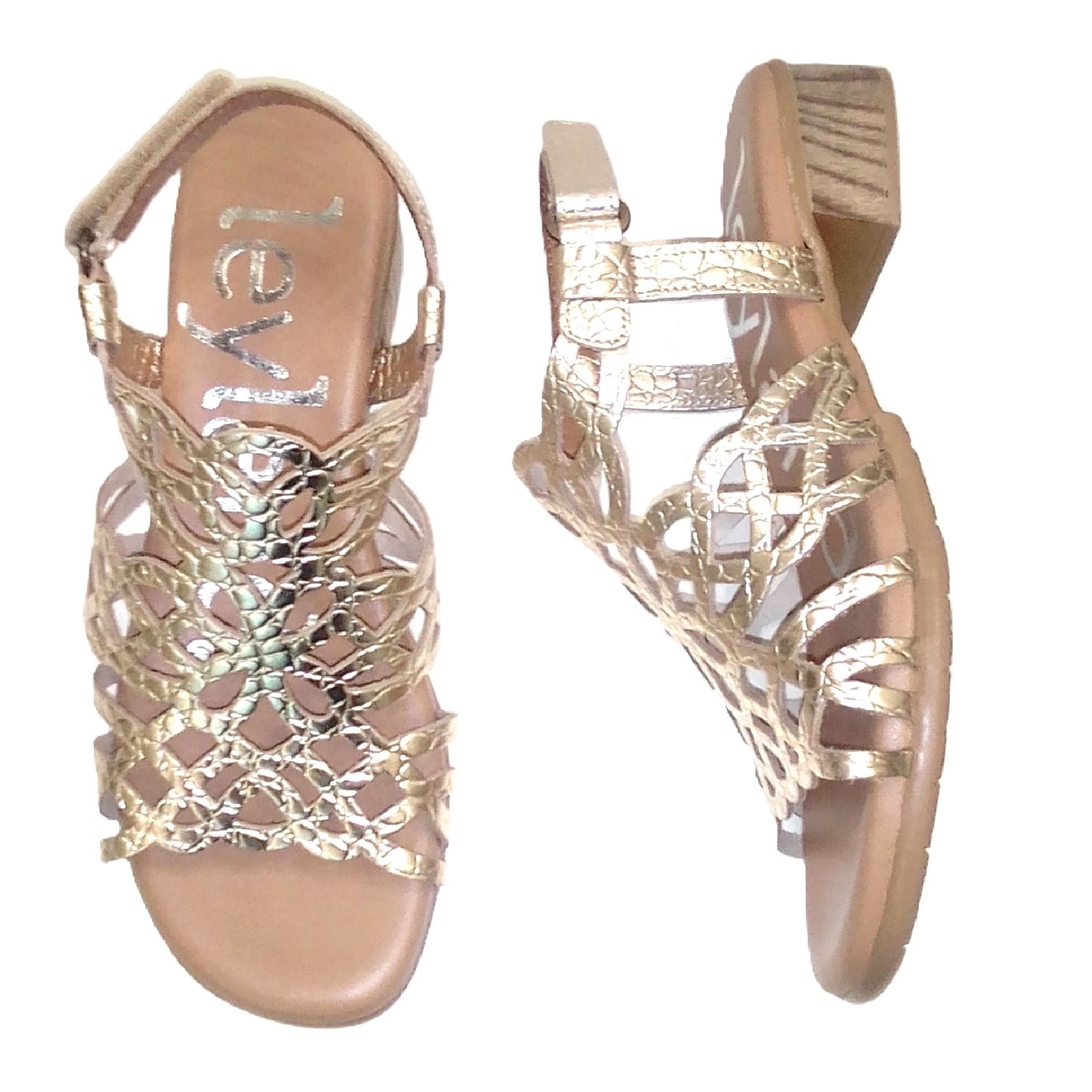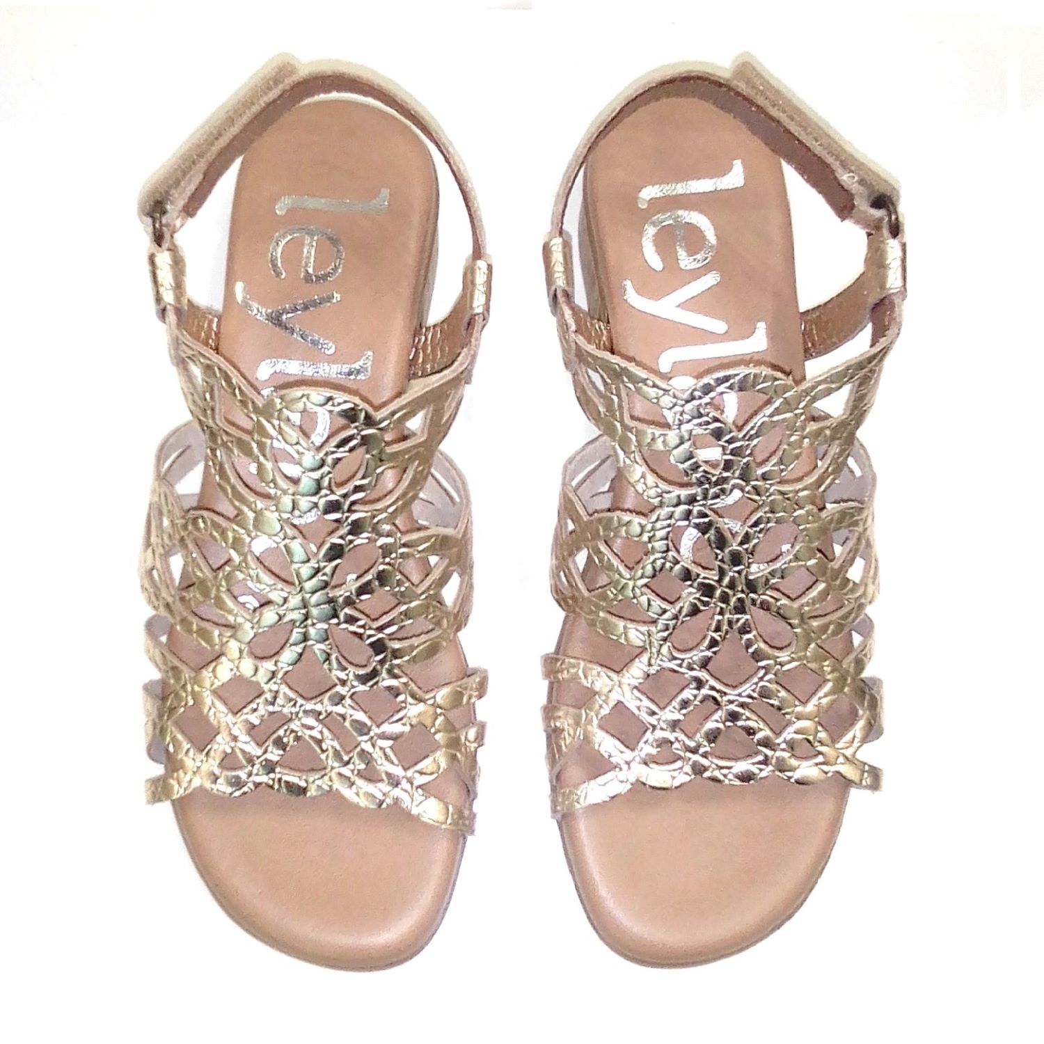 Sandalia plana, en piel champan. Planta de gel. Se abrocha con velcro.