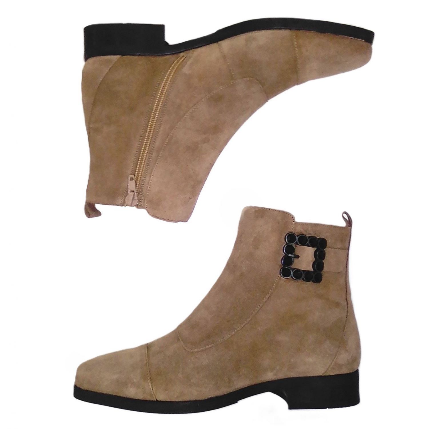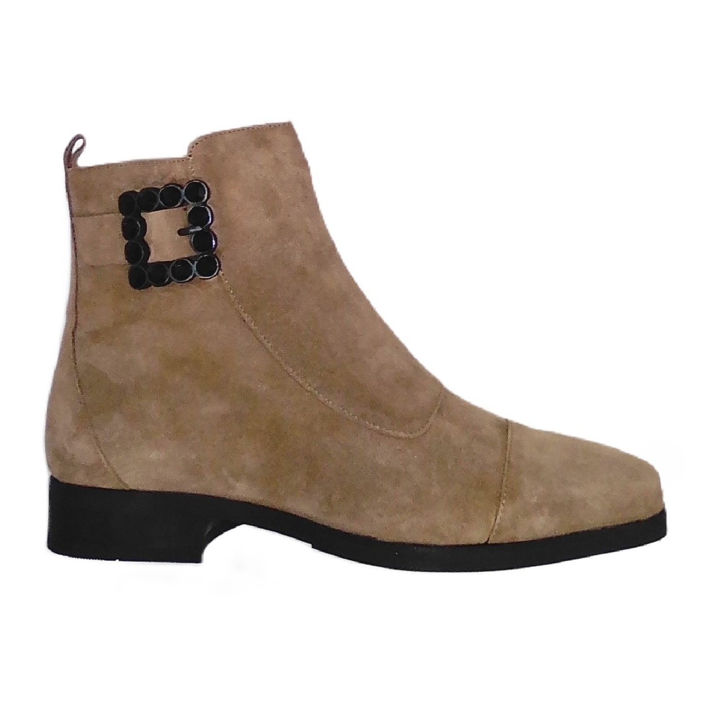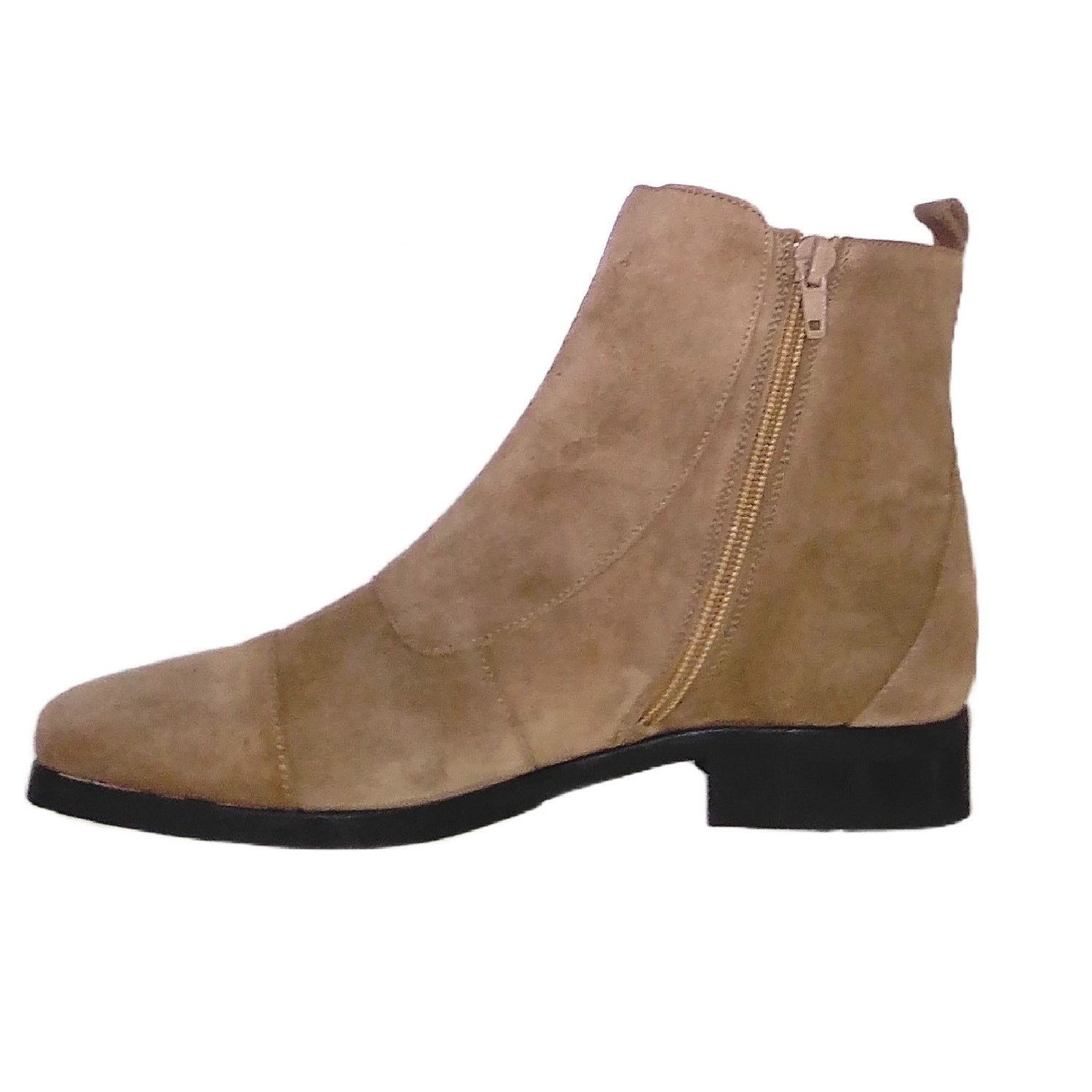 Botin de estilo ingles en piel serraje camel. Se abrocha con la cremallera interior. Estribo en la pala.