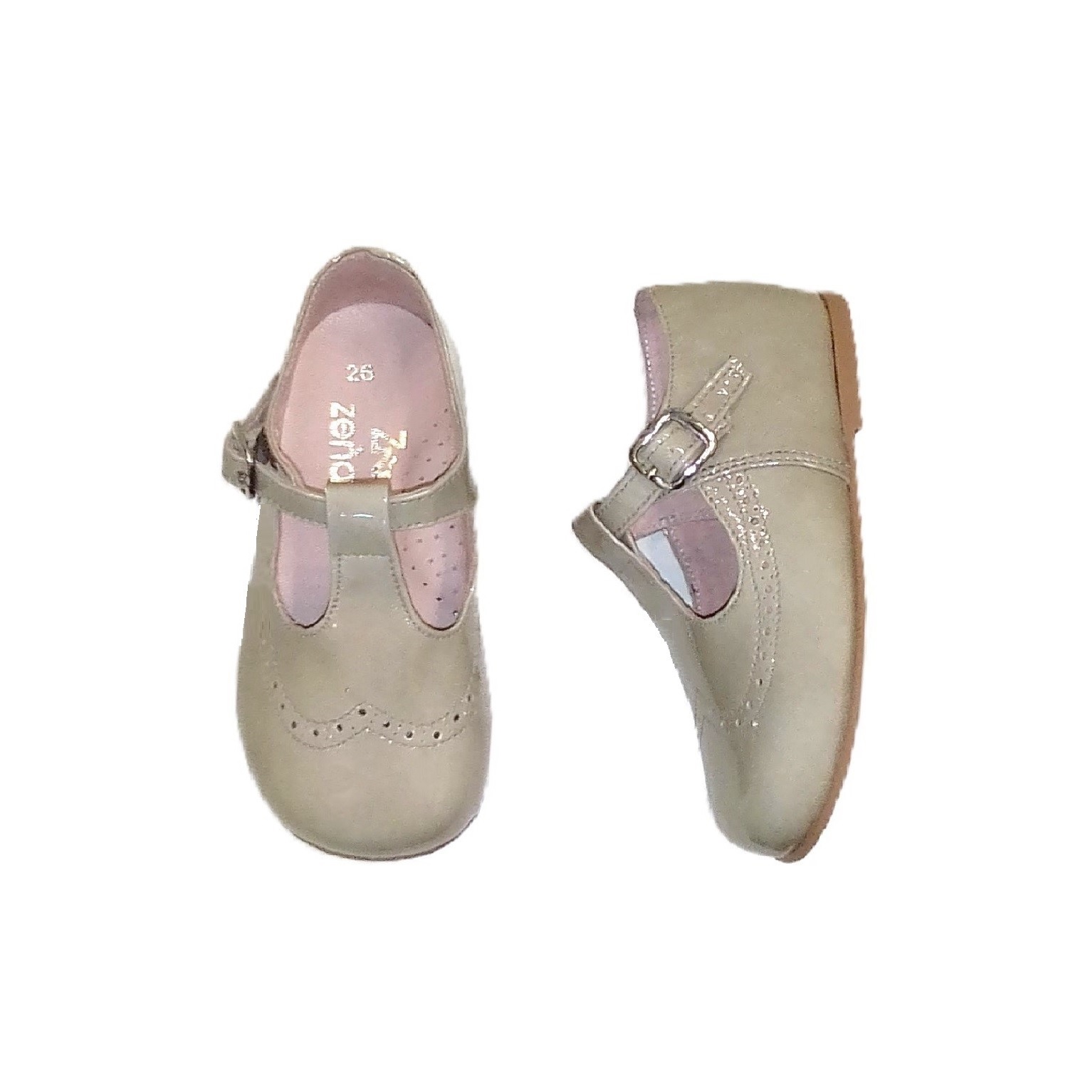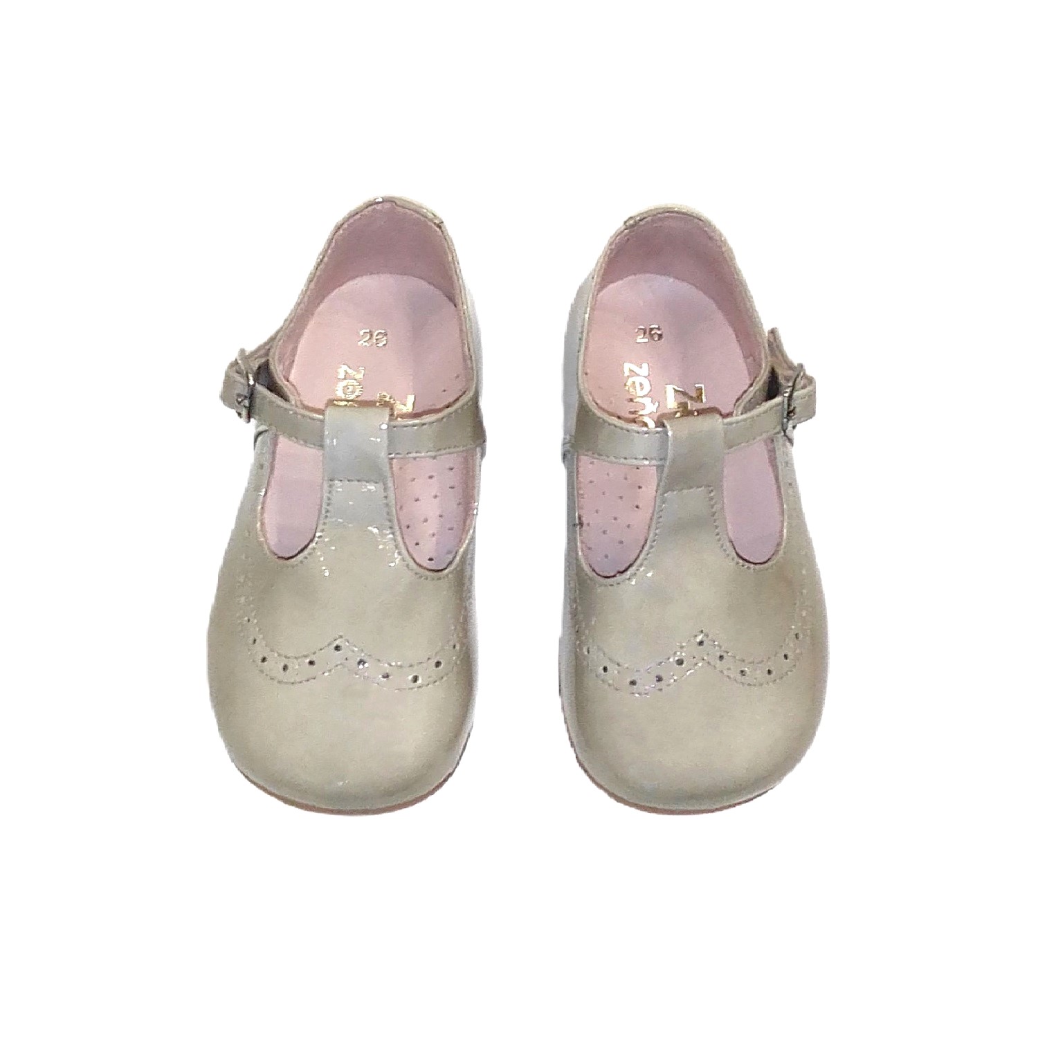 Zapatos de estilo ingles o pepitos en piel acharolada taupe. Coleccion Primeros Pasos. Con hebilla