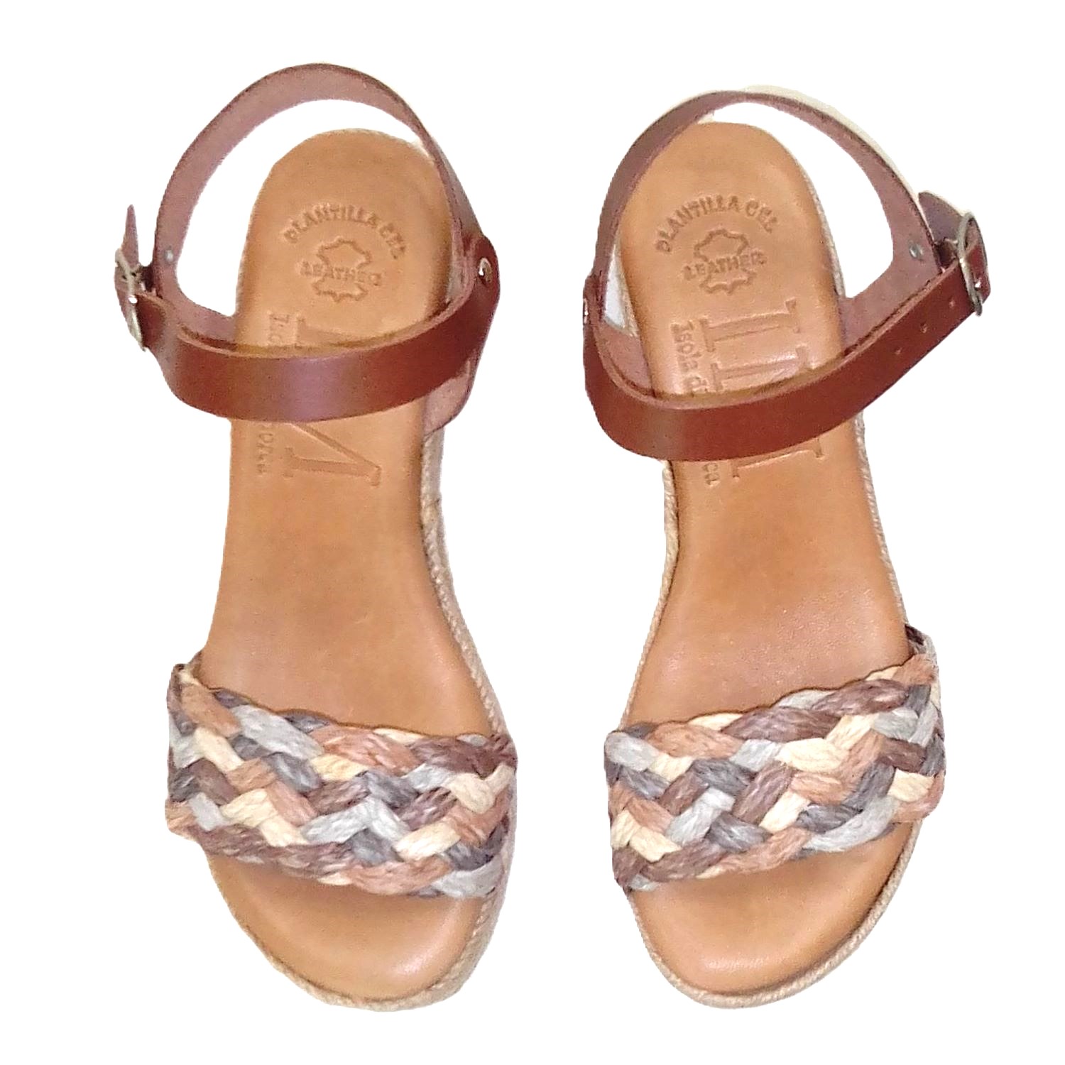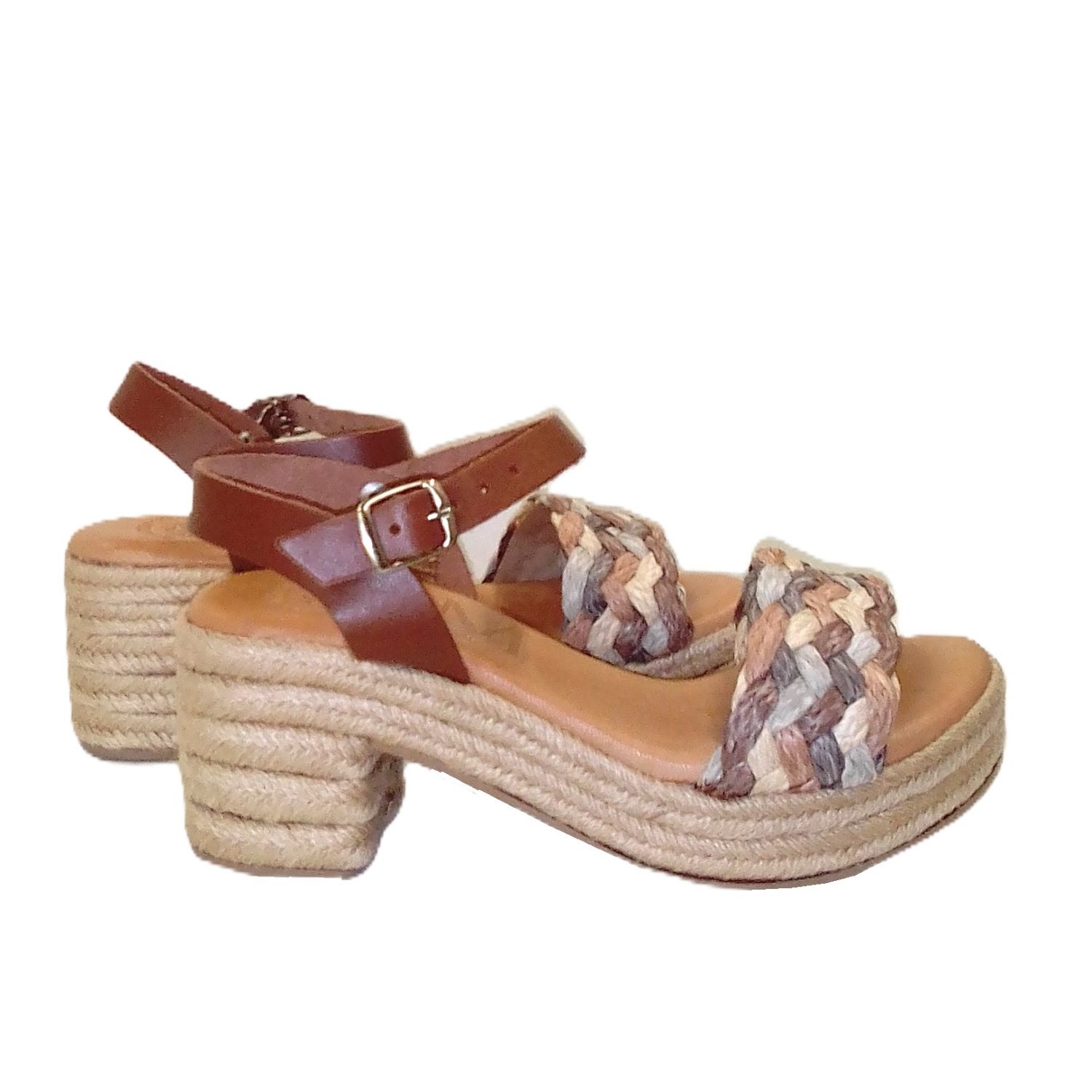 Sandalia con plataforma, en piel y rafia en color tostados y marrones. Planta de gel. Tacon y plataforma forrado en esparto o cuerda. Se abrocha al tobillo con hebilla