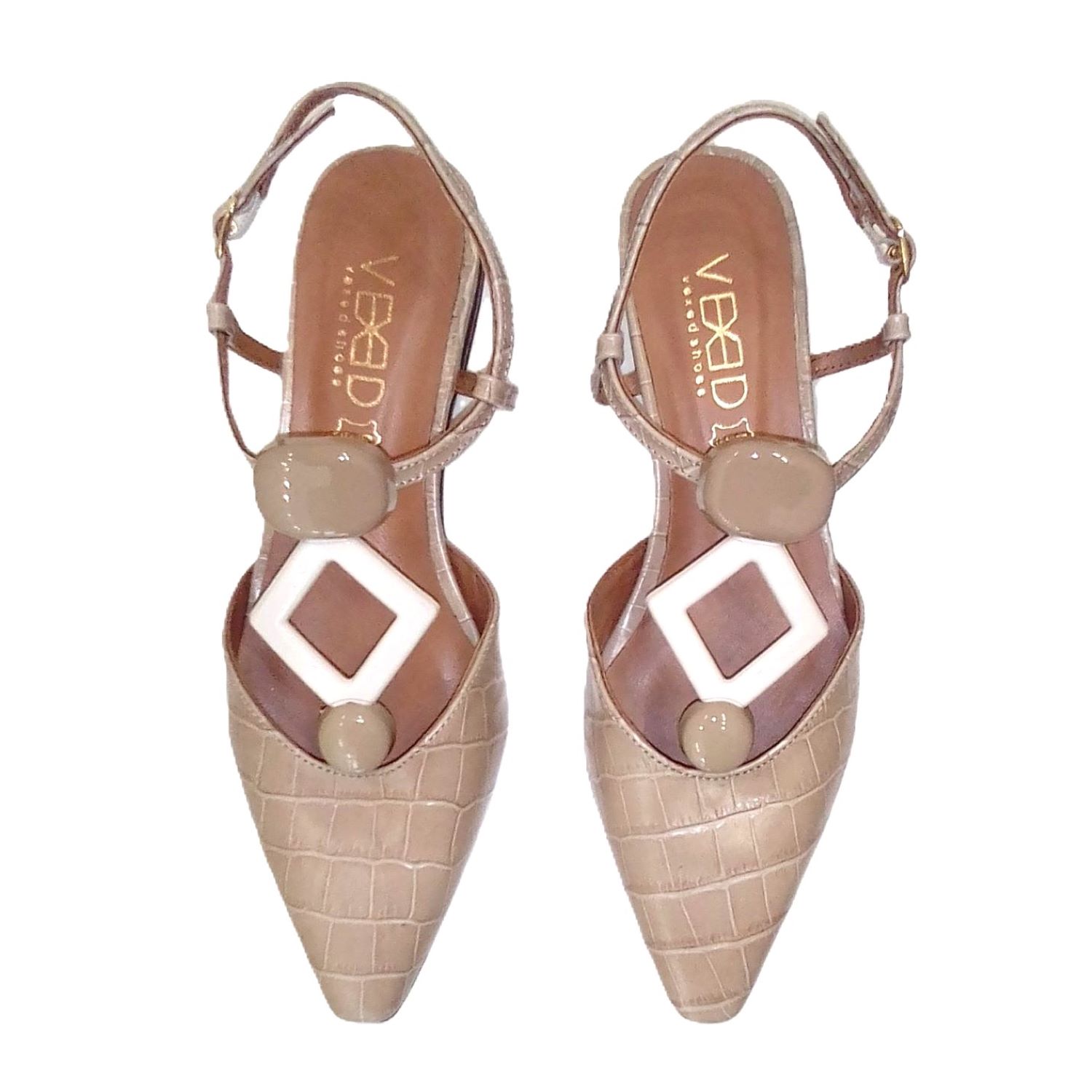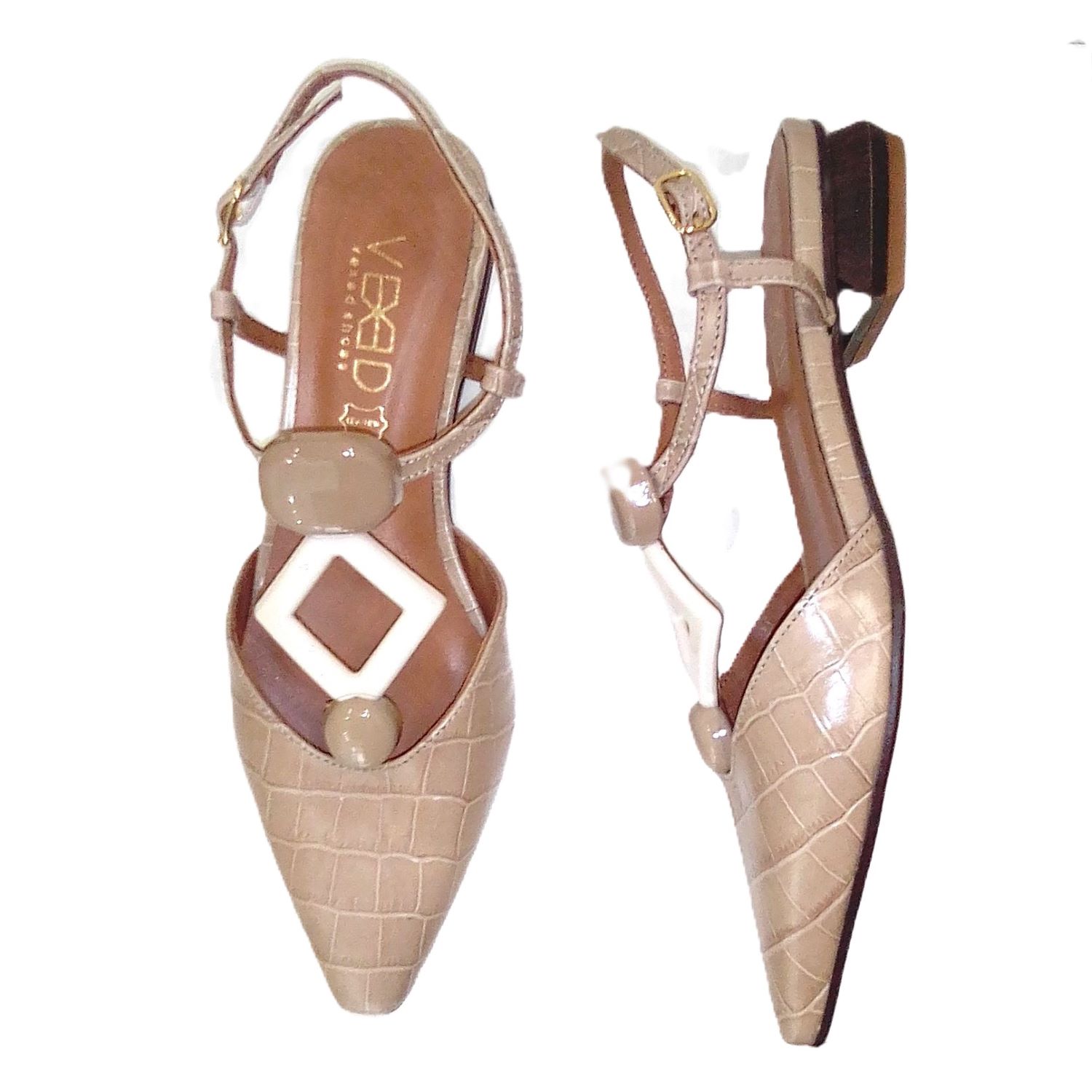 Zapato plano destalonado en piel grabada coco. Detalle de adorno al tono en el empeina y tacon con forma geometrica.