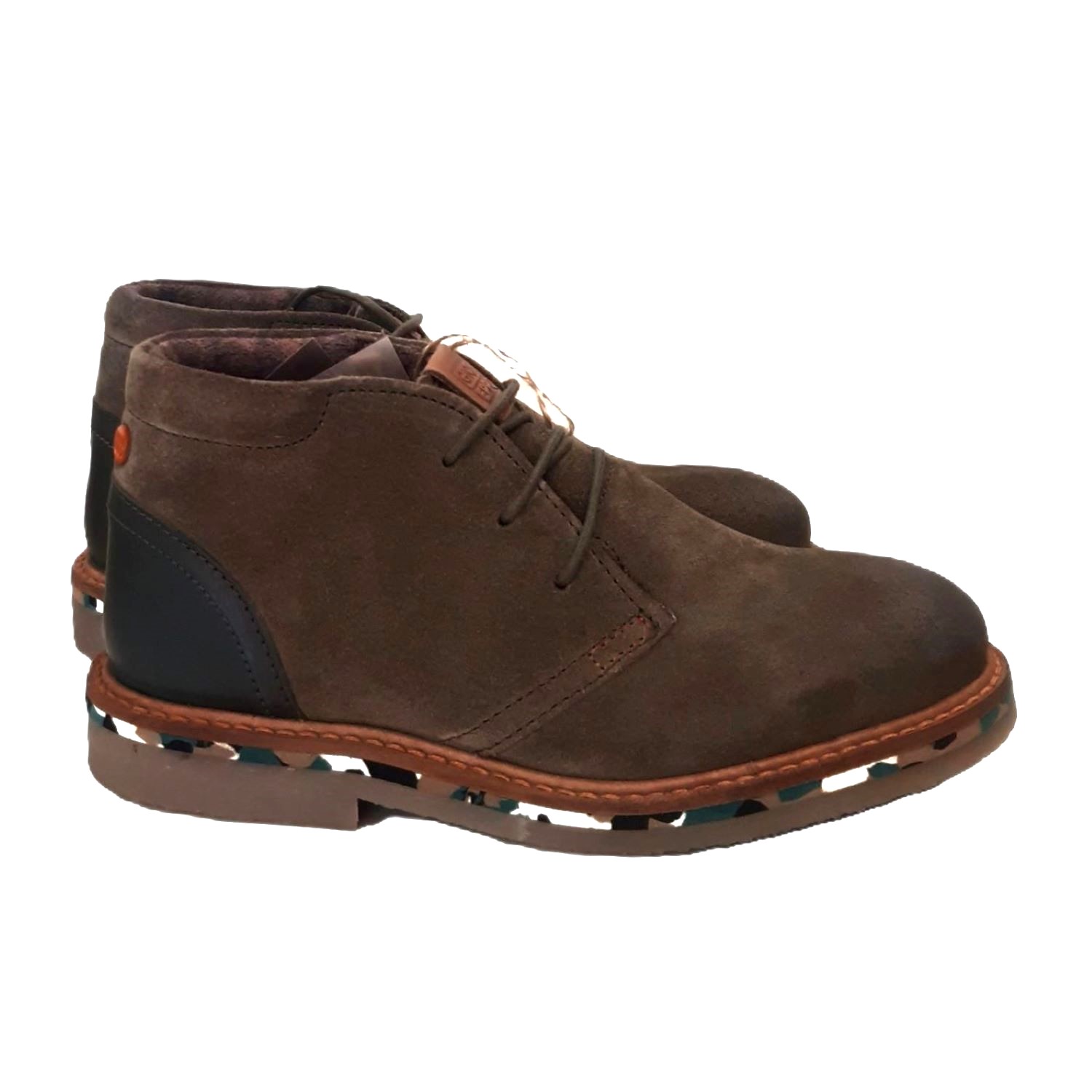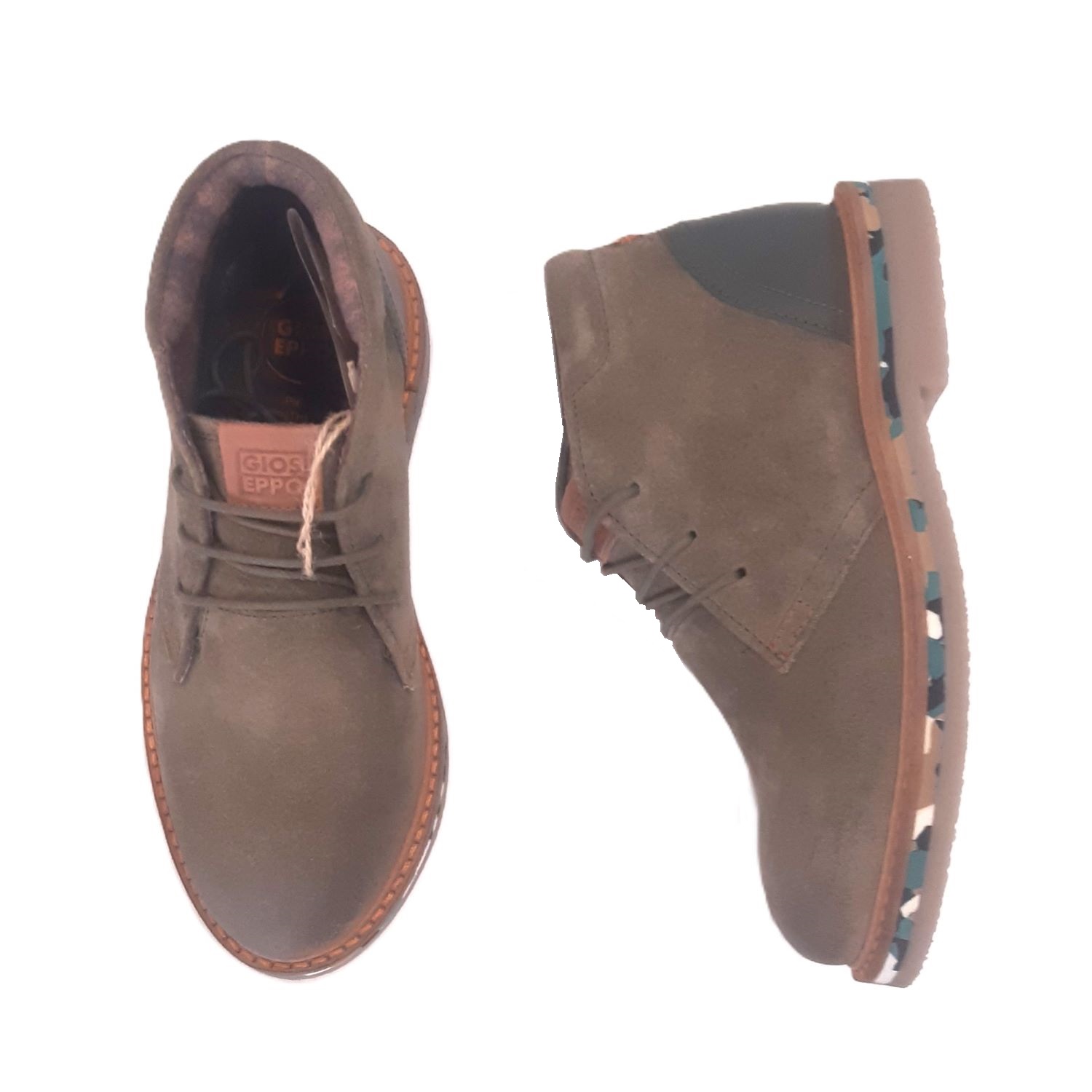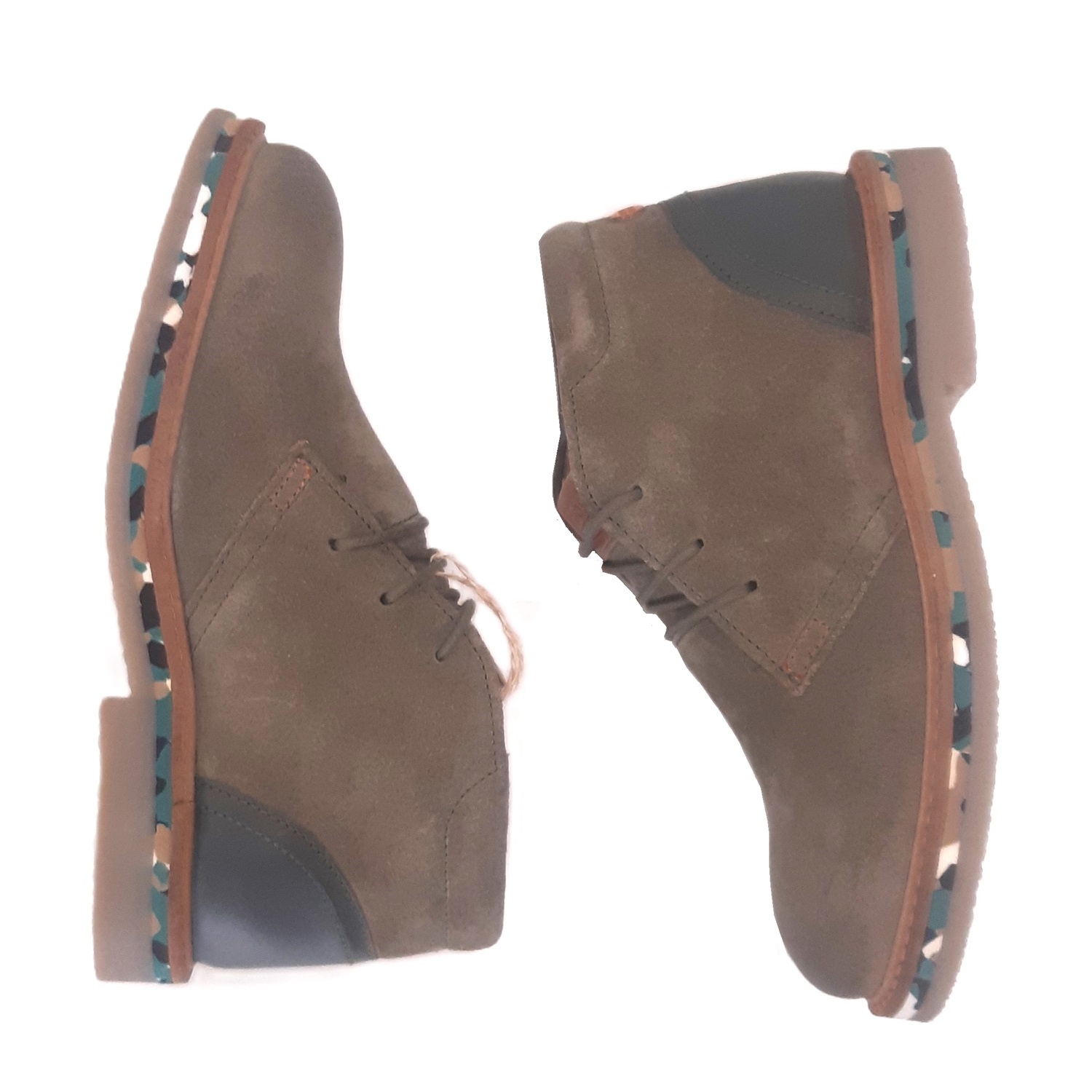 Botas estilo pisacacas en piel serraje y napa verde kaki. Con cordones. Detalles en camuflaje militar en la suela